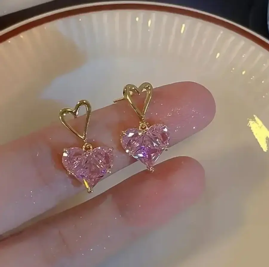 Серьги пусеты Розовые сердца кристаллы золотистые