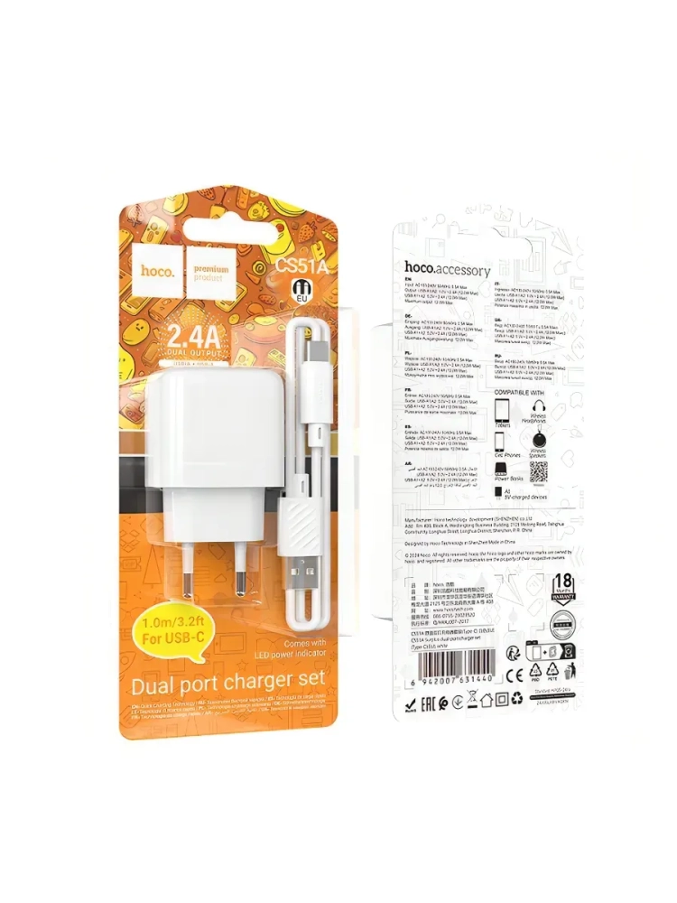 HOCO CS51A — компактное сетевое зарядное устройство с Type-C-кабелем