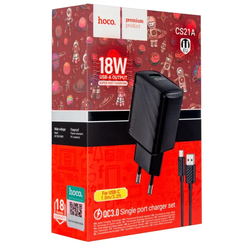 Сетевое зарядное устройство с кабелем USB на Type-C Q.C 3.0 CS21A HOCO черное
