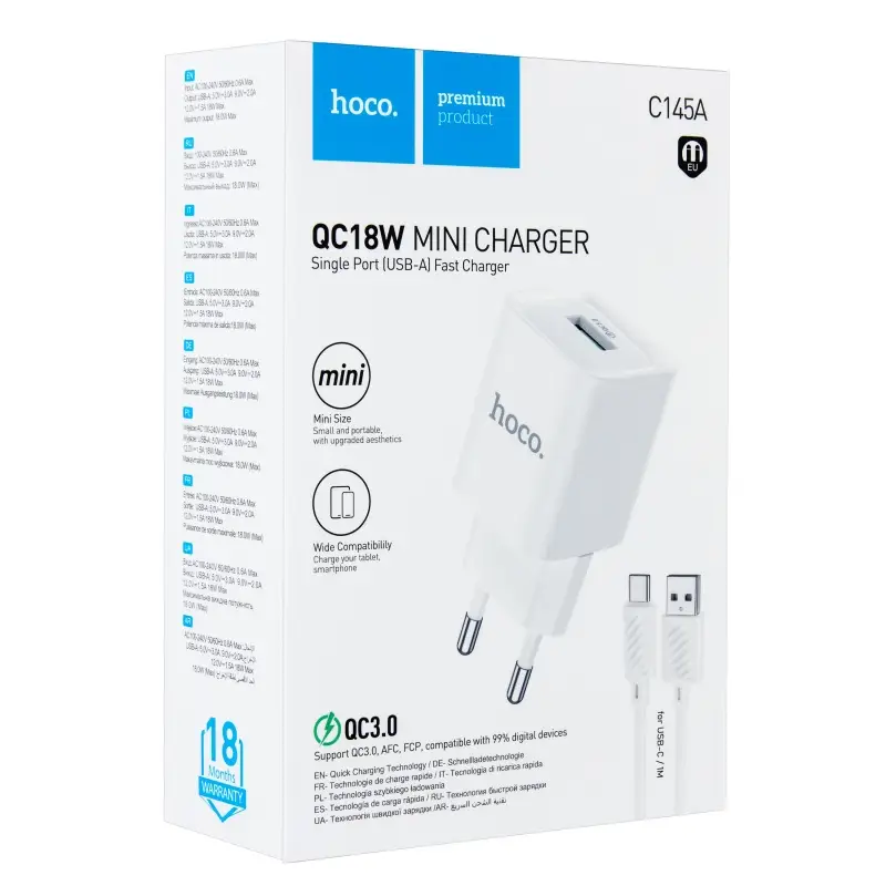 Сетевое зарядное устройство с кабелем USB на Type-C Q.C3.0 C145A HOCO белое