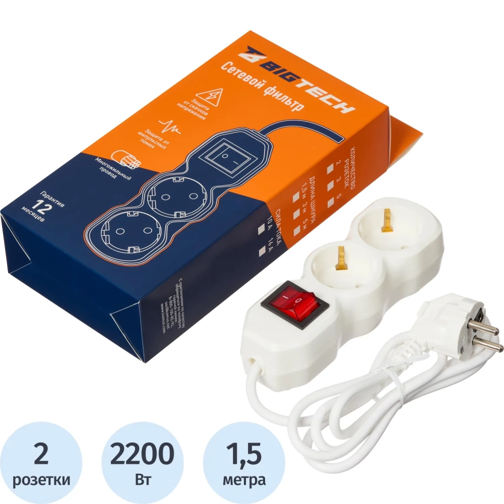 Сетевой фильтр BigTech ST210-1,5-W(2р/1,5м/10А/2,2кВт/3х0,75 мм2/белый)