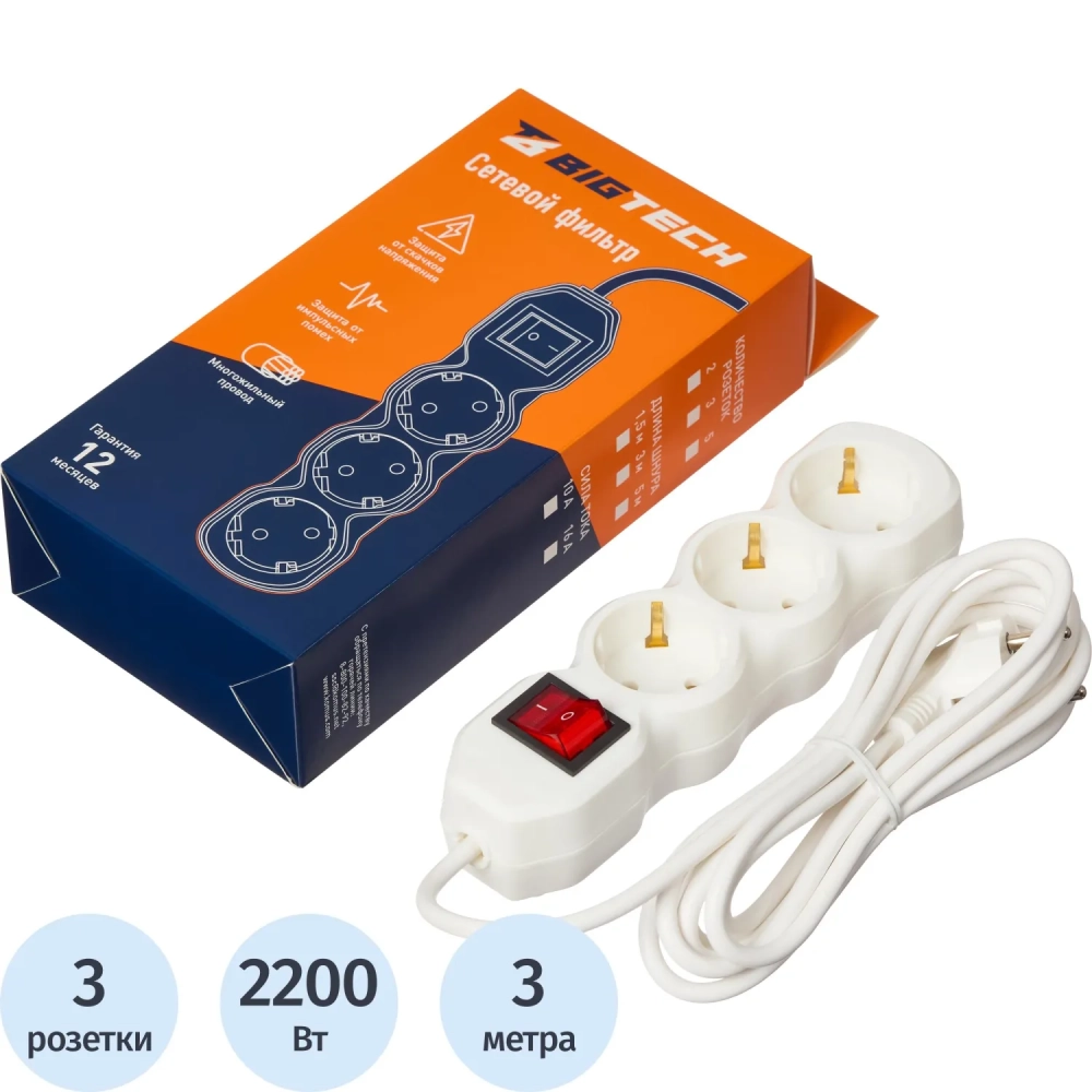 Сетевой фильтр BigTech ST310-3-W(3р/3м/10А/2,2кВт/3х0,75 мм2/белый)