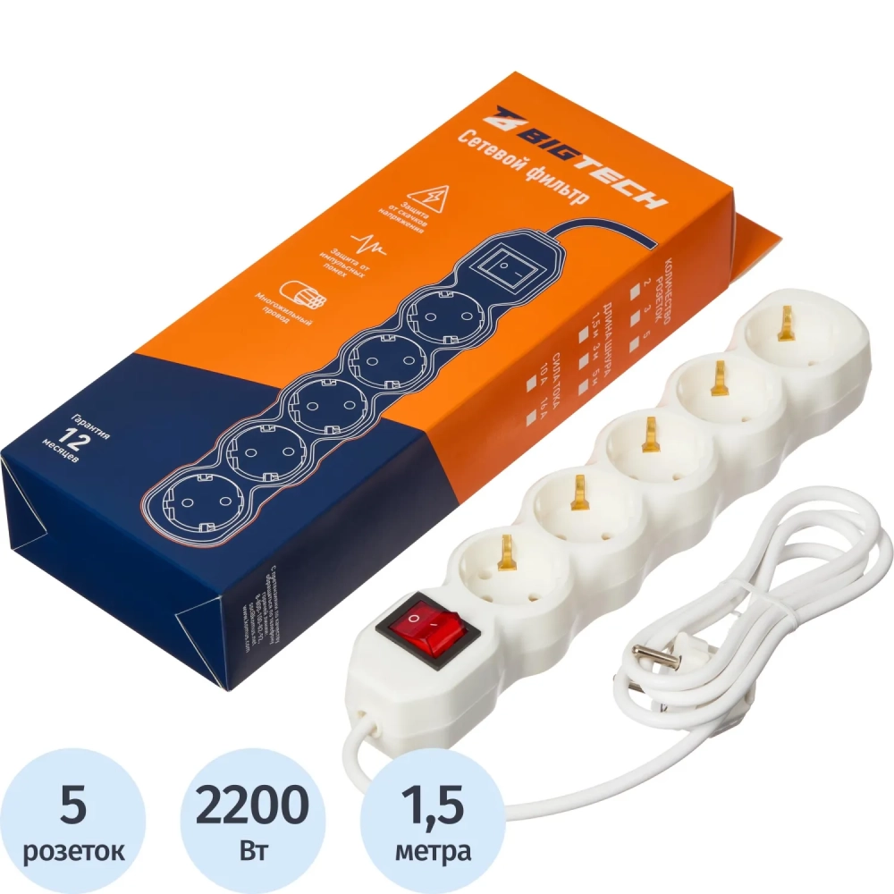 Сетевой фильтр BigTech ST510-1,5-W(5р/1,5м/10А/2,2кВт/3х0,75 мм2/белый)