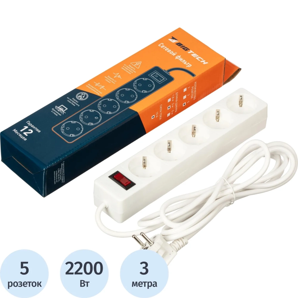 Сетевой фильтр BigTech STD-510-3-W (5р/3м/10А/2,2кВт/1мм2/белый)