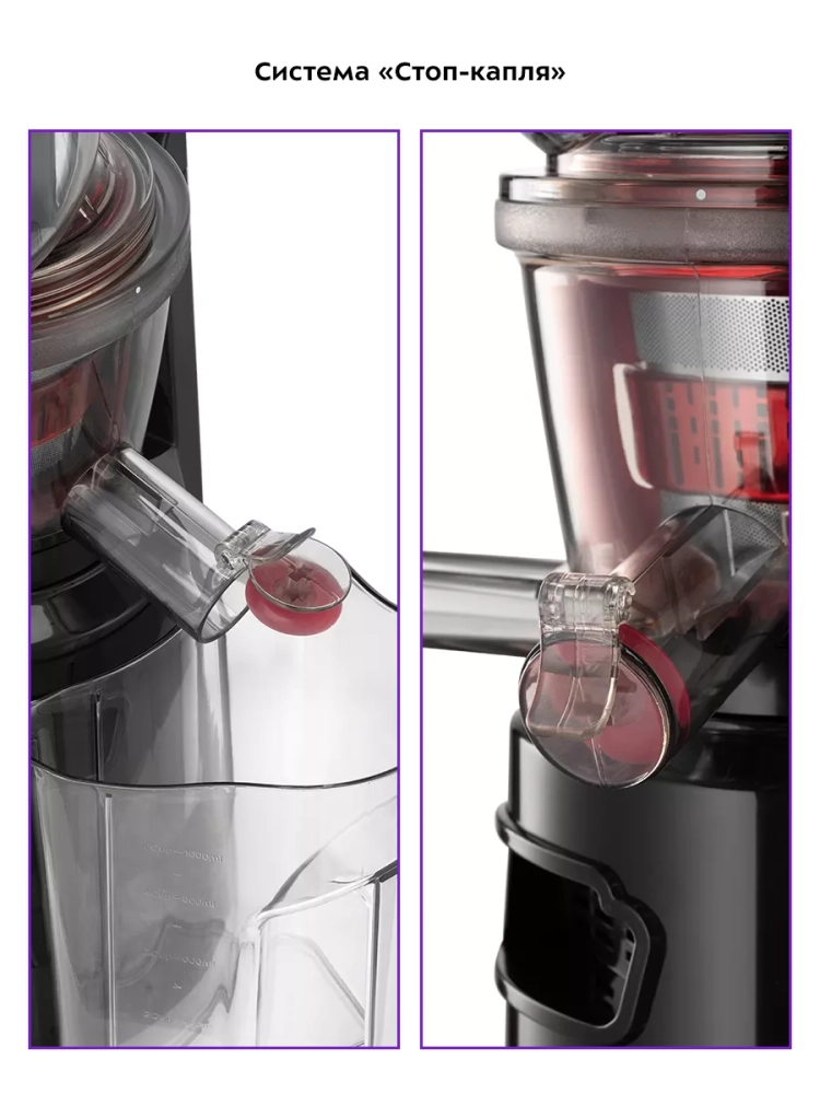 В соковыжималке КТ-1162 предусмотрена система «Стоп-капля». Это удобно, практично и к тому же позволяет сохранить поверхность вокруг соковыжималки чистой.