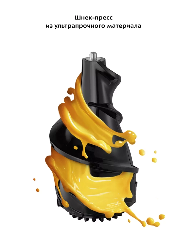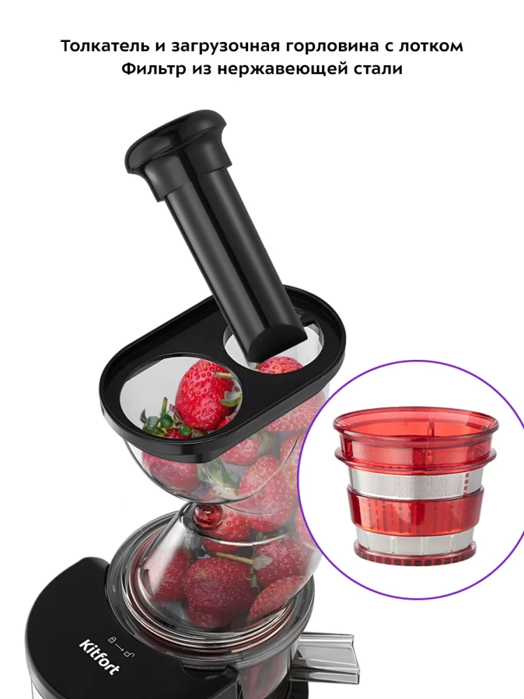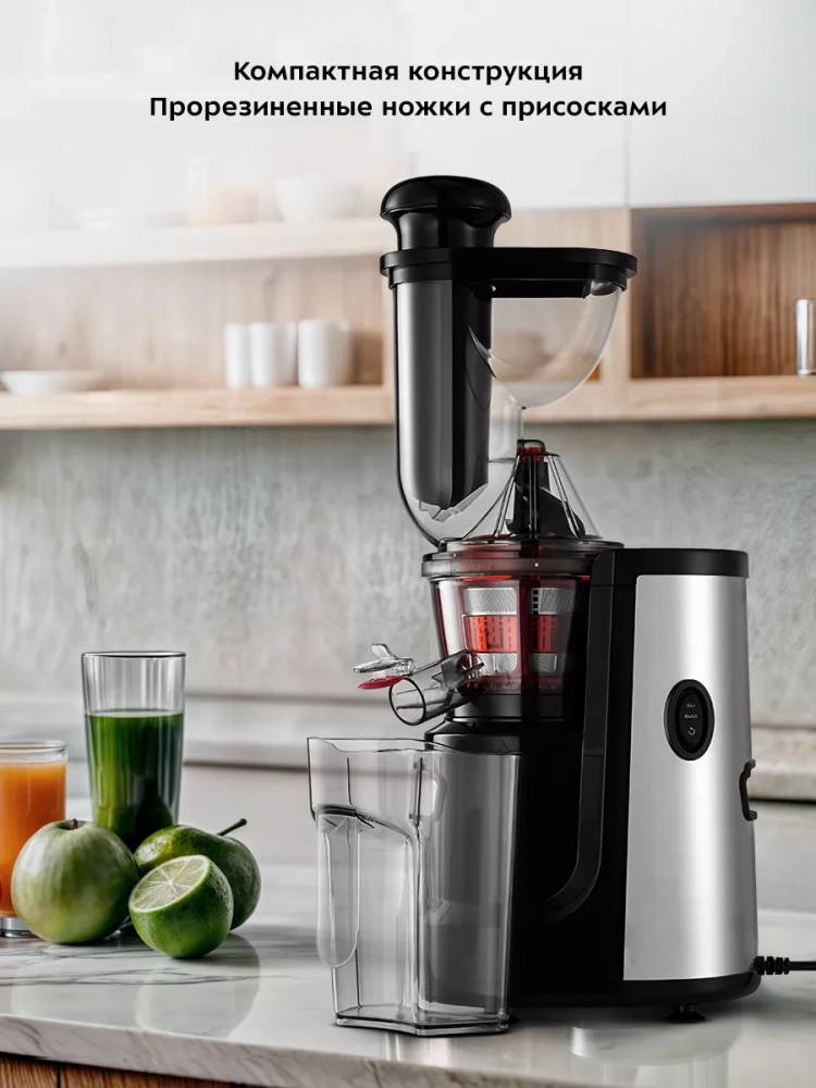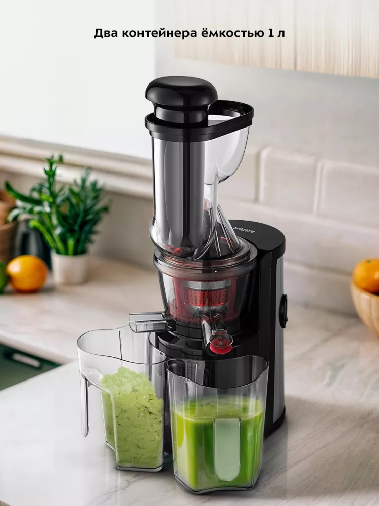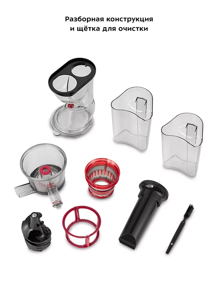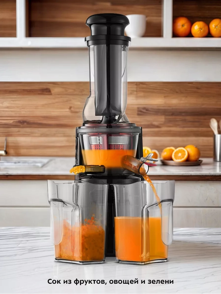 В комплекте предусмотрены толкатель для безопасного проталкивания продуктов, прозрачный контейнер для жмыха (1 л) и такой же контейнер для сока. Широкая загрузочная горловина с двумя отверстиями позволяет загружать продукты, не нарезая их слишком мелко, что ускоряет процесс приготовления сока.