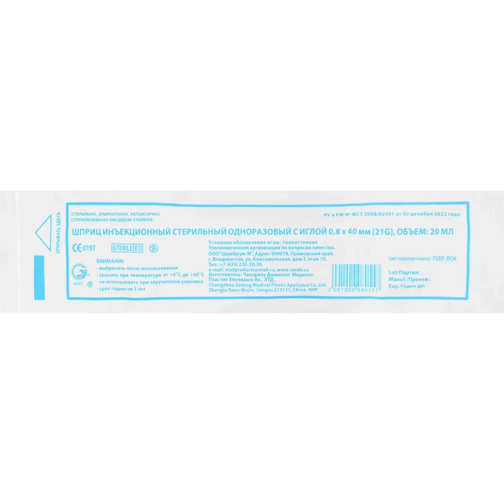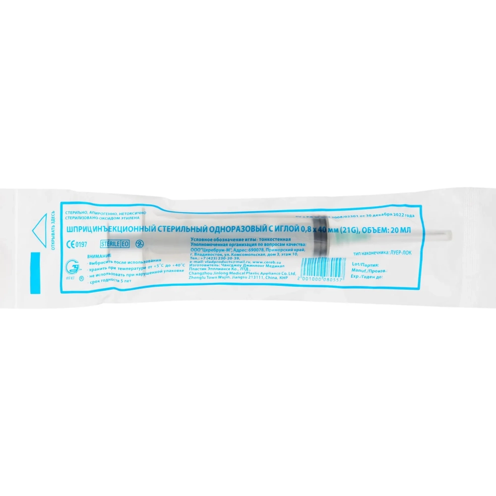 Шприц 3-комп. однораз. 20мл LL 21G(0,8x40) над. 40шт/уп Джинлонг