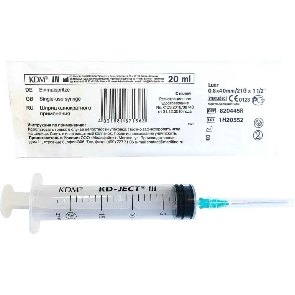 Шприц 3-комп. однораз. 20мл LS 21G(0,8x40) прил. 50шт/уп KD-Ject III