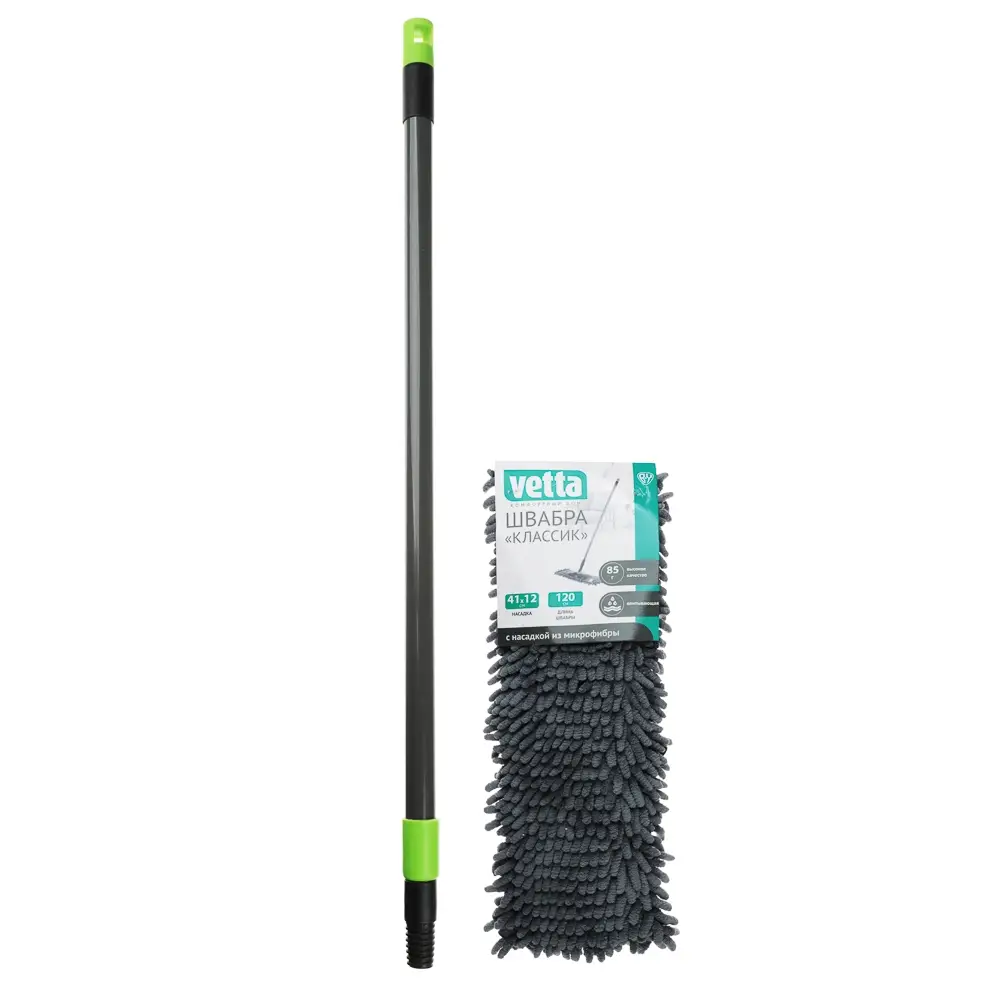 Швабра Vetta для мытья пола используется для влажной уборки внутри помещений. Микрофибра отлично впитывает влагу. Телескопическая ручка позволяет легко настроить комфортную высоту. Швабра не оставляет разводов, ворсинок. Отлично собирает шерсть животных, песок, волосы. прекрасно впитывает воду. Подходит для всех типов напольных покрытий. Насадку можно стирать в стиральной машине без использования абразивных моющих средств. Материал: микрофибра шенилл. Длина ручки: 120 см.