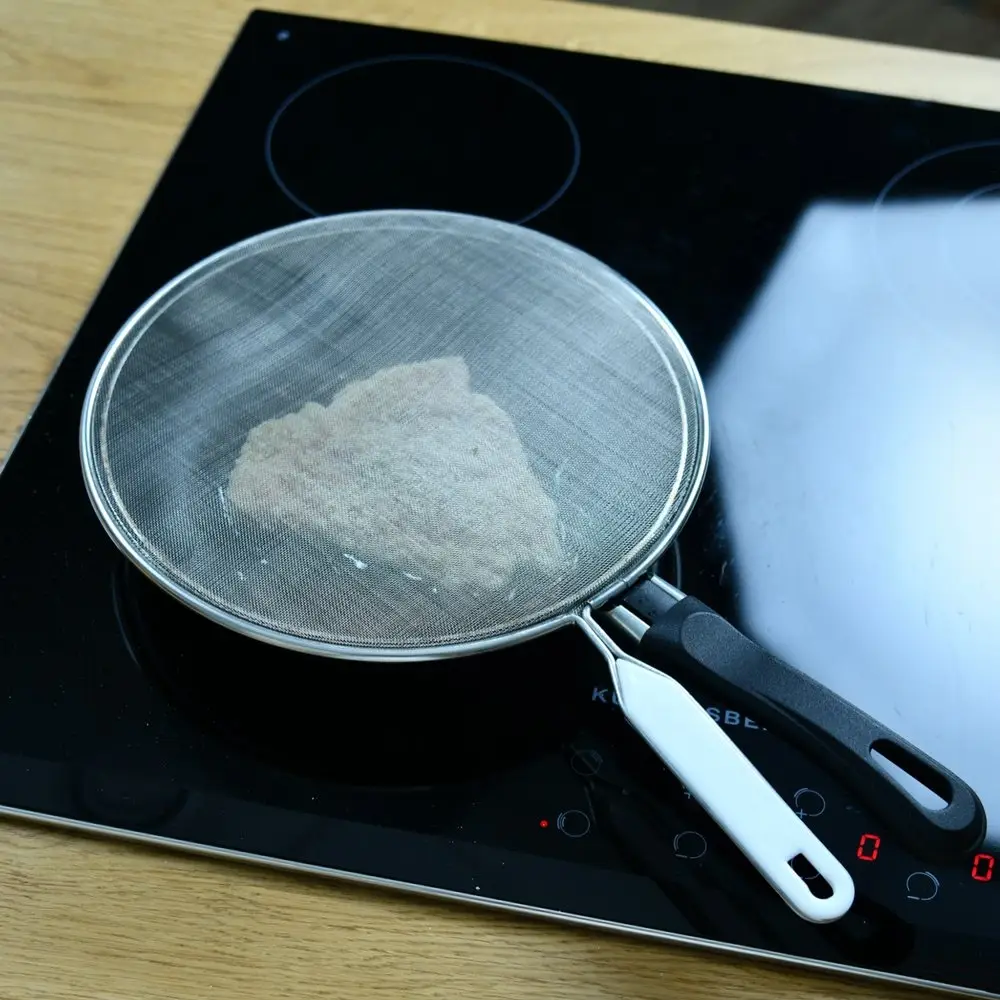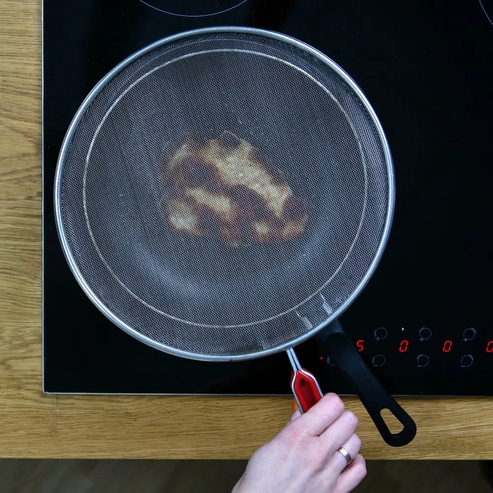 Защищает от брызг кипящего масла. Изготовлено из стальной сетки с коррозионностойким (хромированным) покрытием, ручка из стали со ставкой из термостойкой пластмассы. Диаметр 26 см.