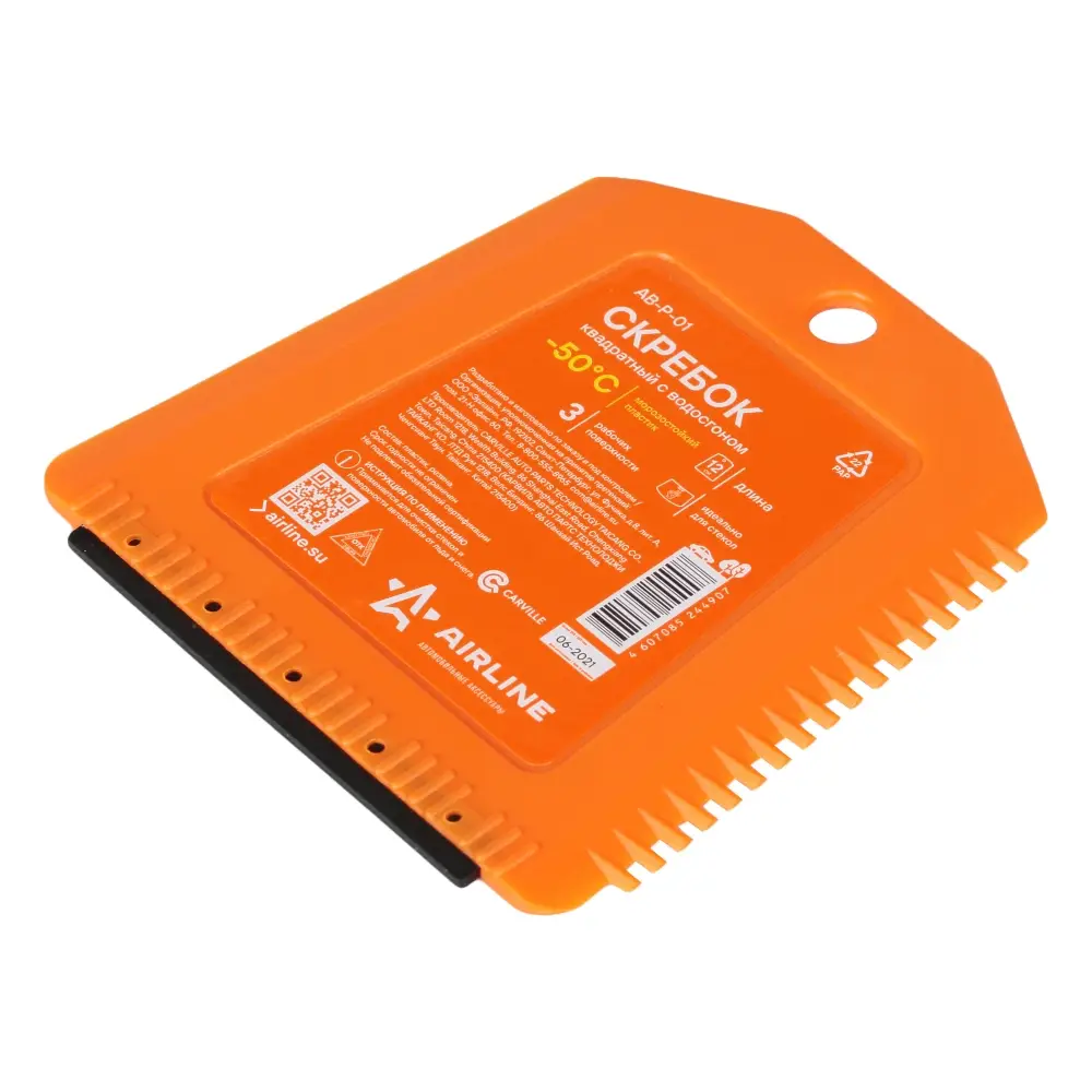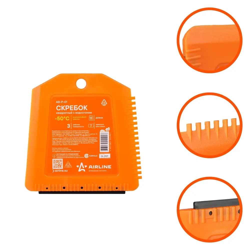 Скребок представляет собой изделие квадратной формы оранжевого цвета. На боковой и нижней части изделия расположены рабочие поверхности. Ребристая поверхность скребка позволяет удалить загрязнения или лед в сложно доступных местах, а водосгон устраняет разводы с корпуса автомобиля.