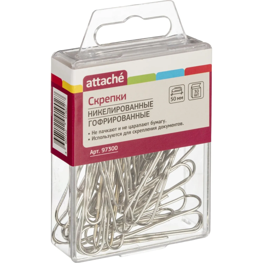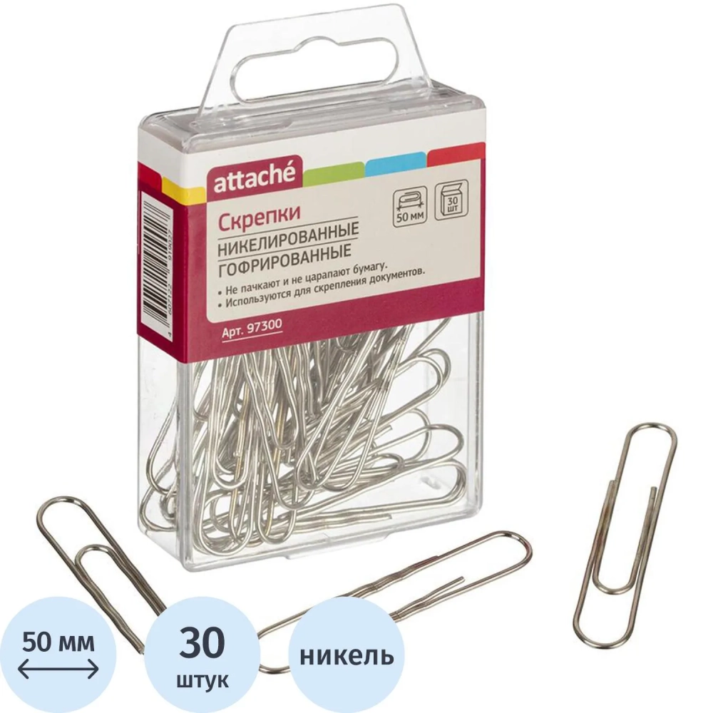 Скрепки Attache никелированные, 50 мм, гофрированные,европодвес, 30 шт/уп