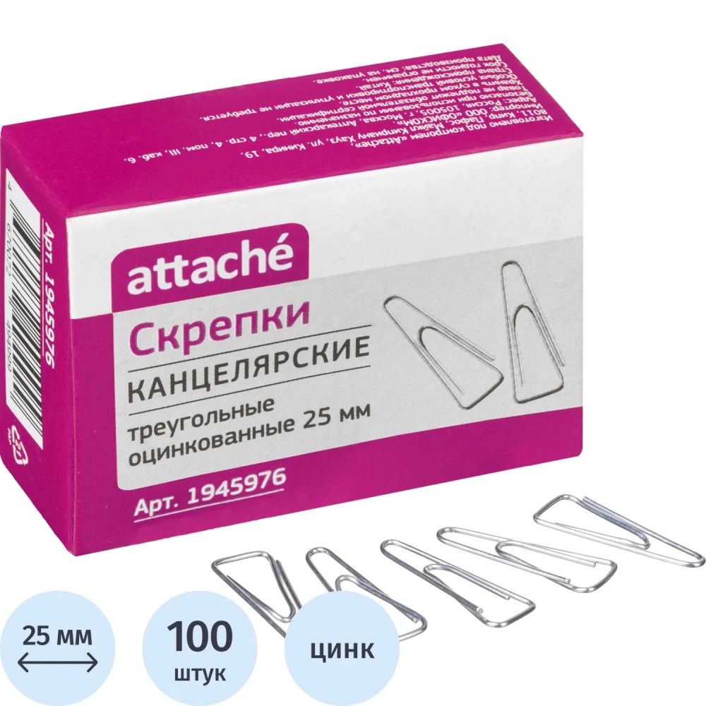 Скрепки Attache оцинкованные треугольные 25 мм, негофрированные, 100шт/уп