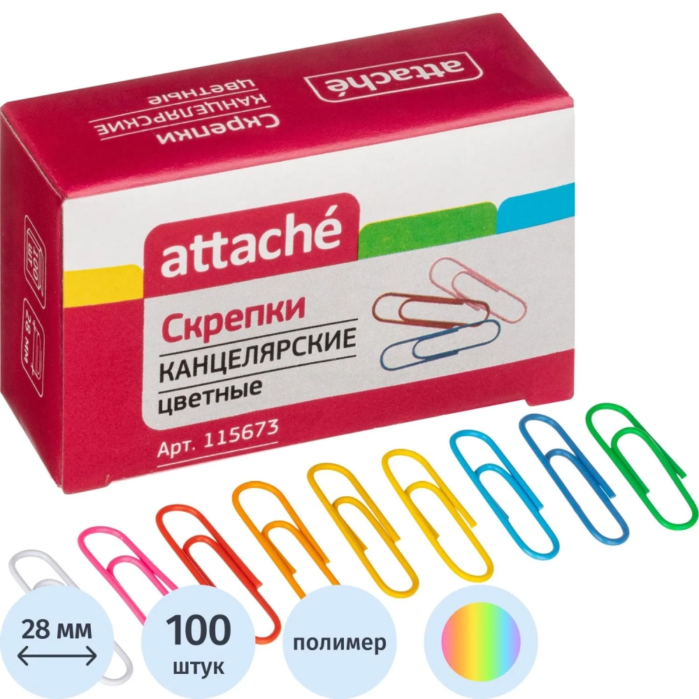 Скрепки Attache с полимерным покрытием,28 мм, разноцветные, 100 шт/уп