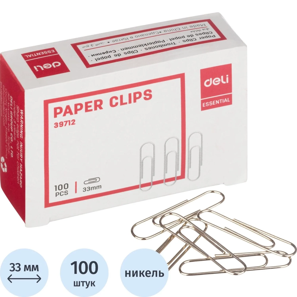 Скрепки Deli никелированные, 33 мм, негофрированные,100 шт/уп