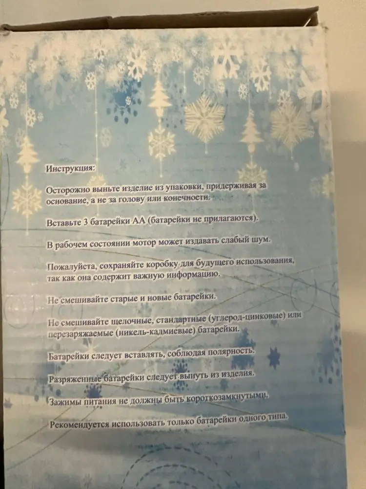 Снегурочка работает от трех батареек типа АА. Подарите себе мгновения радости и волшебства в этот Новый год!