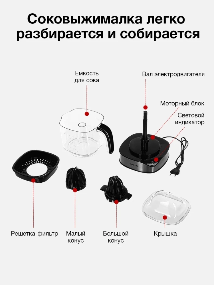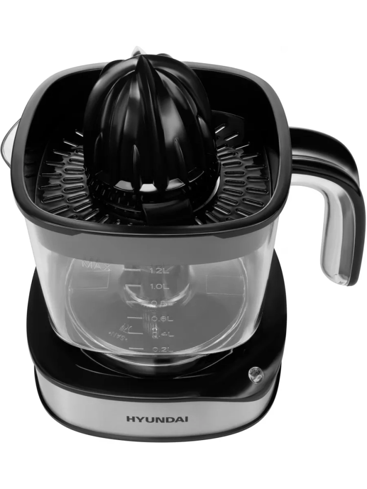Соковыжималка Hyundai HY-JC4123 черный/нержавеющая сталь, цитрусовая, мощность 30Вт, резервуар для сока 1200мл, вращение в обе стороны.