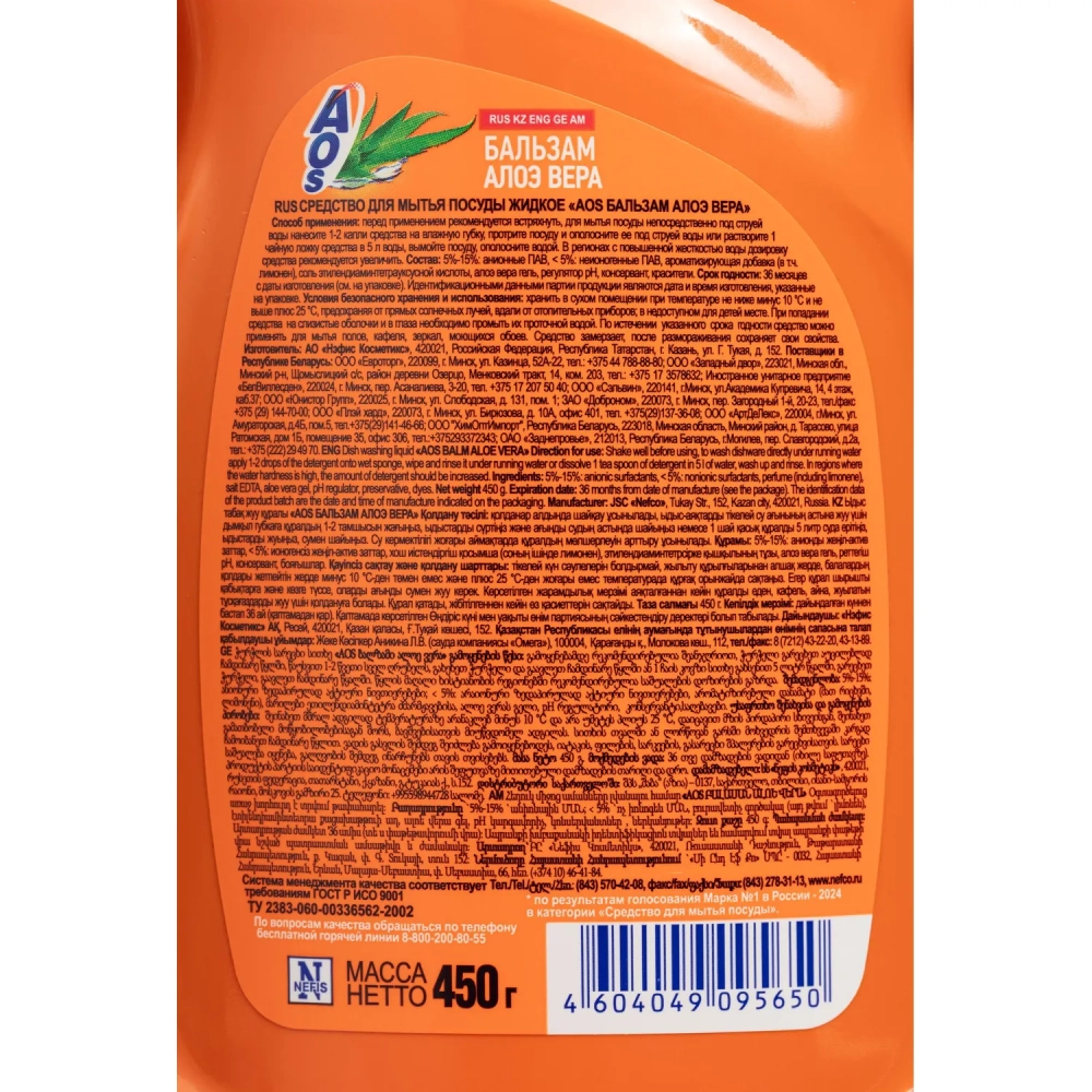 Средство для мытья посуды AOS Бальзам Алое вера 450гр