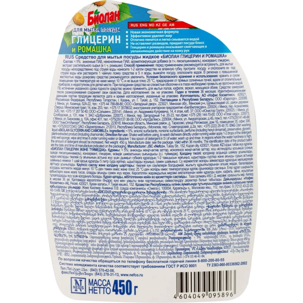 Средство для мытья посуды Биолан Глицерин и ромашка 450гр