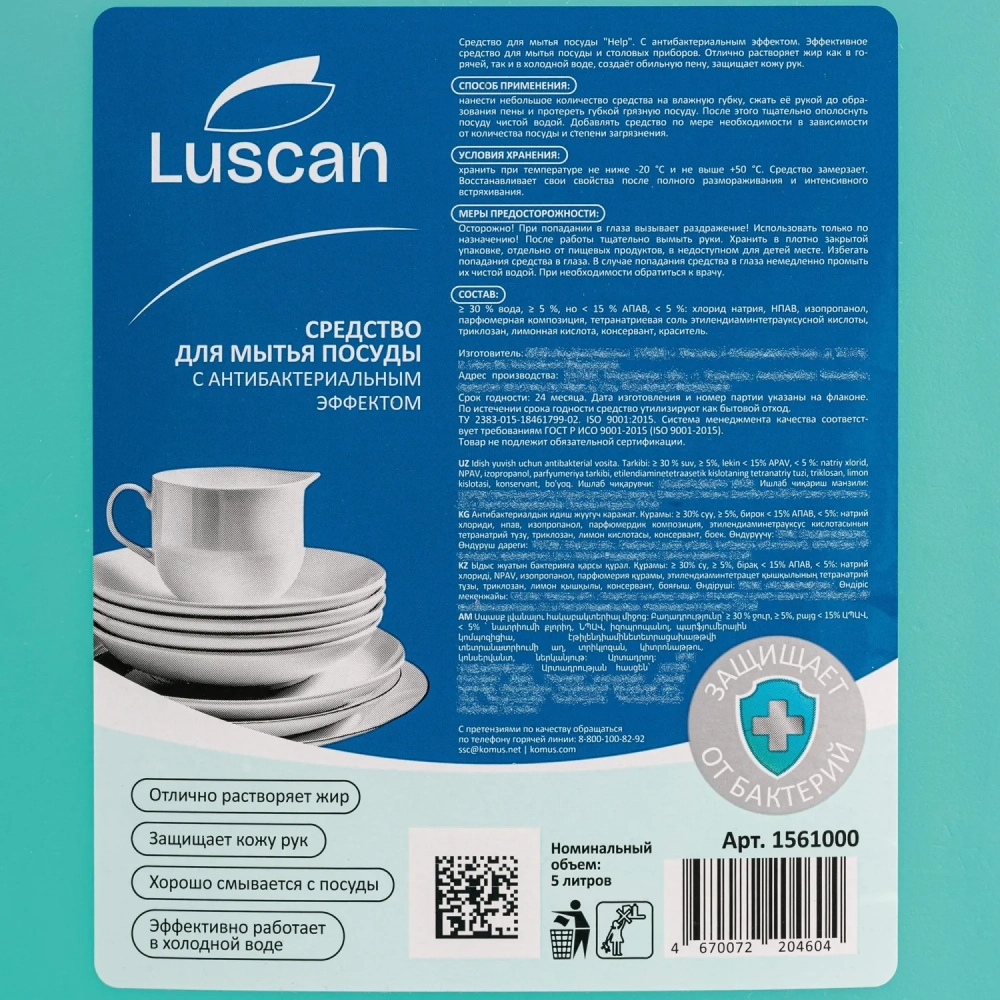 Средство для мытья посуды Luscan антибактериальное 5л канистра