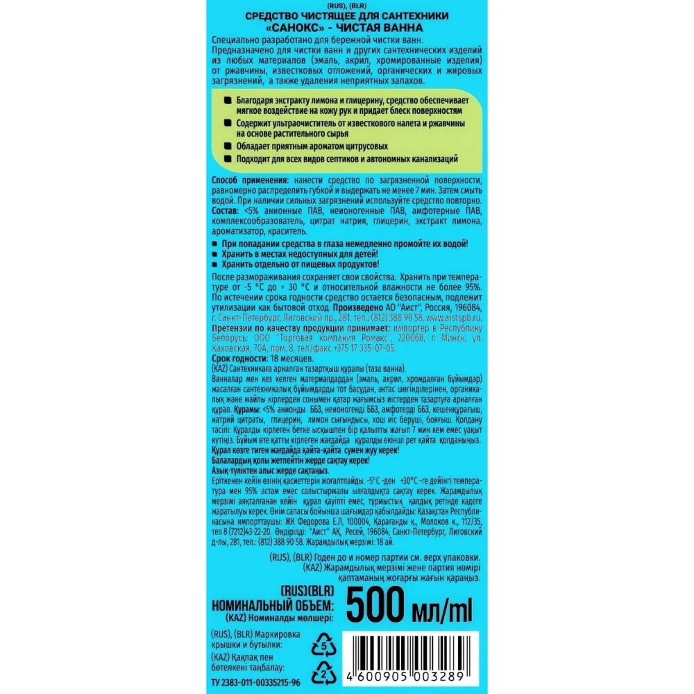 Средство для сантехники и чистки ванн Санокс чистая ванна 500мл