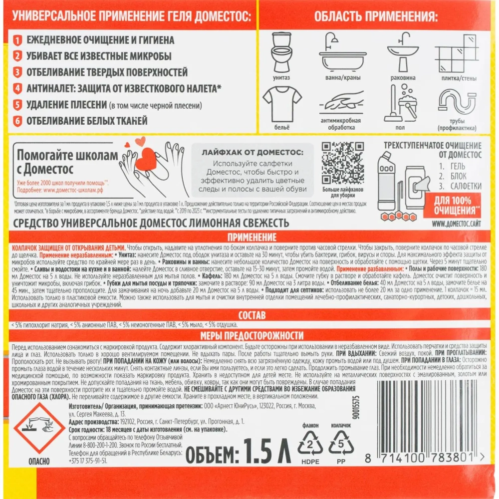 Средство для сантехники универсальное Доместос ЛИМОННАЯ СВЕЖЕСТЬ 1,5 л