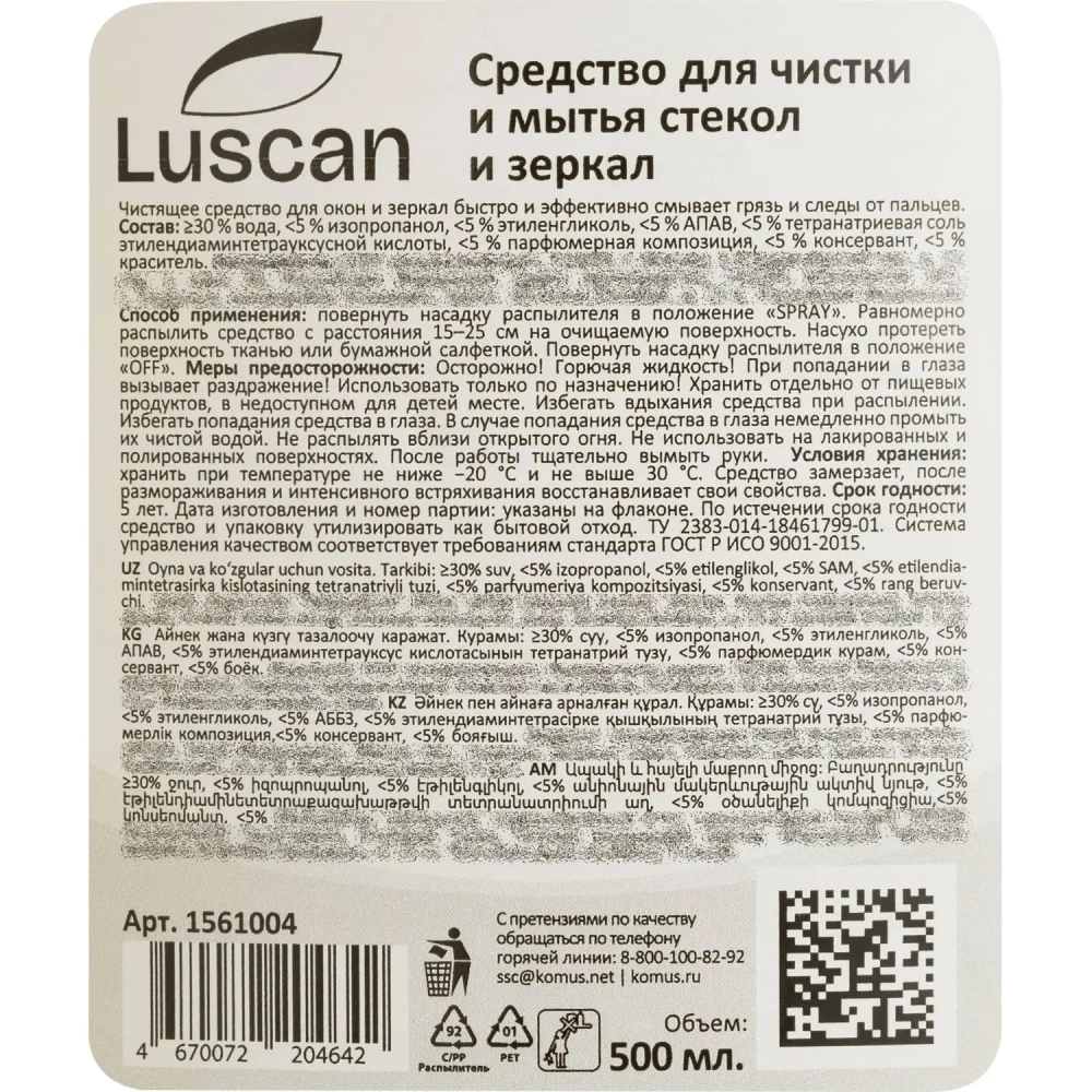 Средство для стекол и зеркал Luscan 500мл триггер
