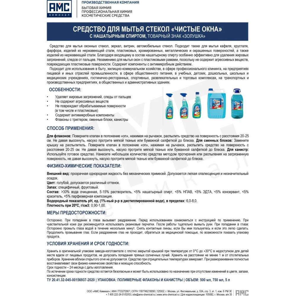Средство для стекол и зеркал ЗОЛУШКА 500мл с нашатырным спиртом с триггером