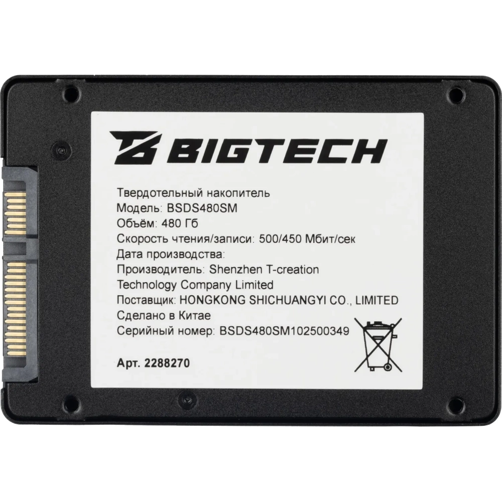SSD накопитель BigTech 2.5, SATA, 480Gb, TLC, R/W 500/450Мб/с(BSDS480SM)