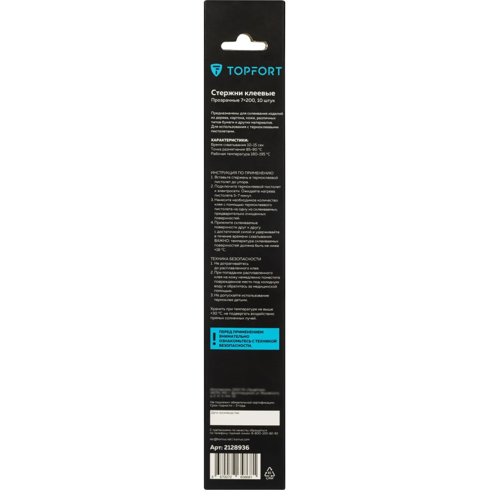 Стержни клеевые прозрачные 7x200, упаковка 10 штук, Topfort