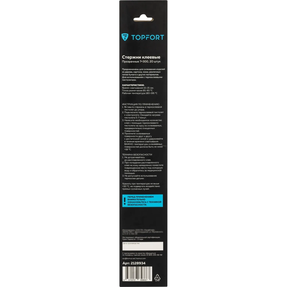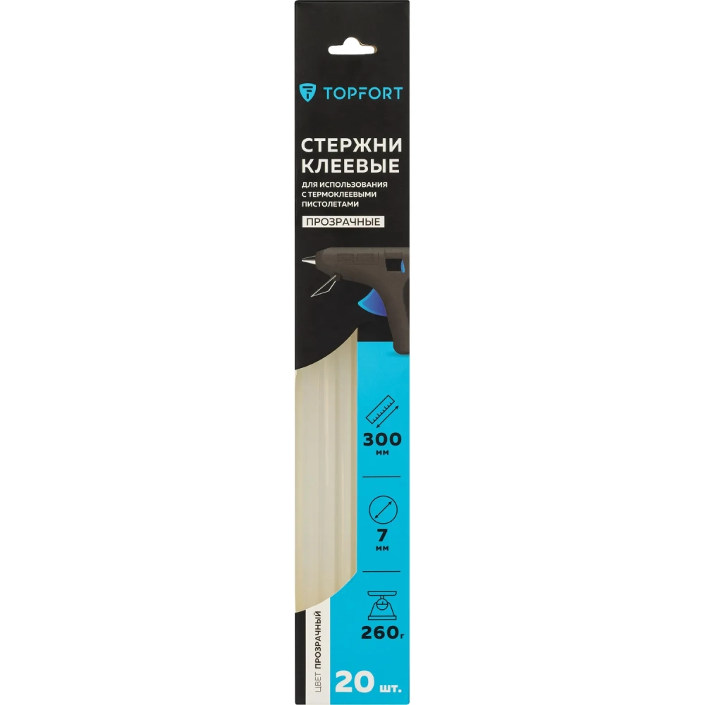 Стержни клеевые прозрачные 7x300, упаковка 20 штук, Topfort