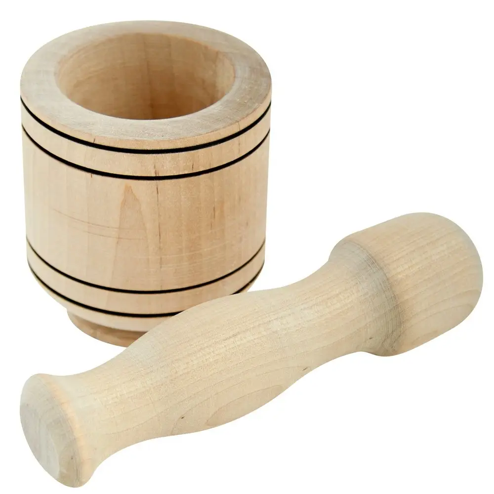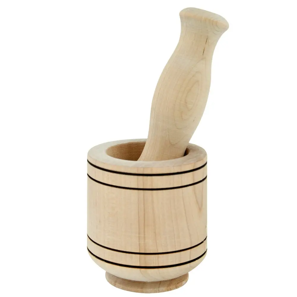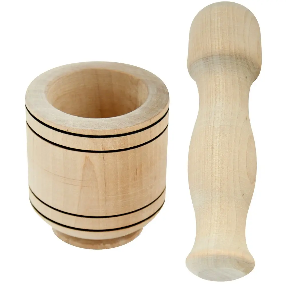 Ступка с пестиком - идеальное приспособление для растирания трав, зелени, семян, орехов, а так же подходит для измельчения соли, сахара, кофе. Толкушка эргономичной формы не даст вашим рукам устать, что позволит вам готовить блюда с ароматными пряностями, с большим комфортом и удовольствием. Изготовлено: дерево (береза). Размер ступки: 10х9,5см, размер пестика: 17х4см