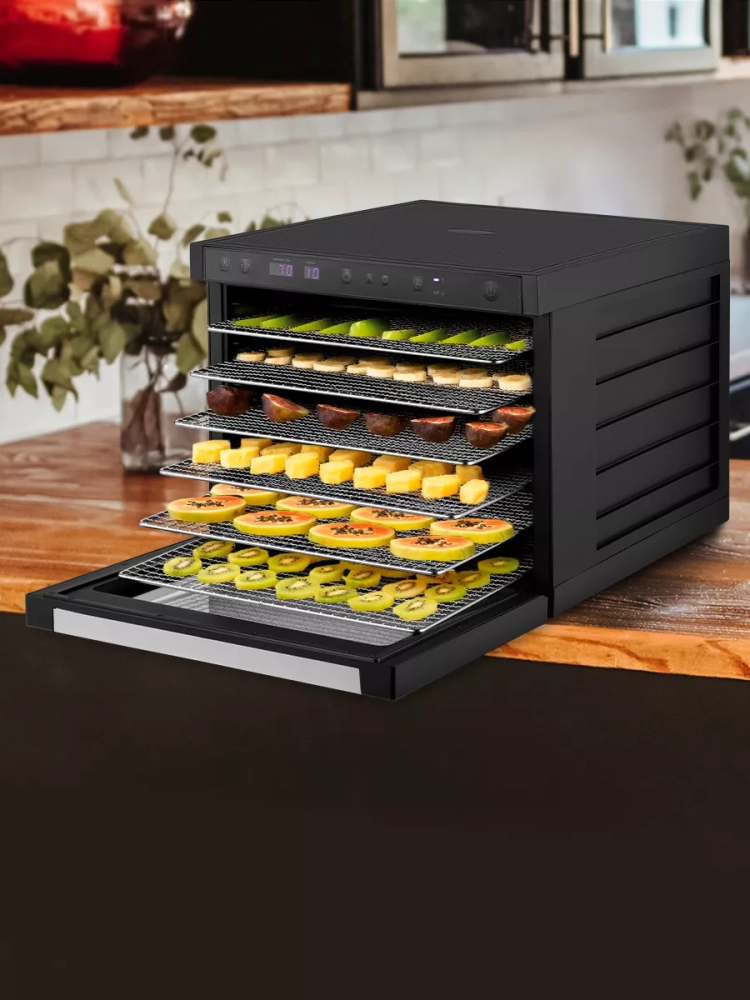 У сушилки есть 3 предустановленных режима. Первый режим — это режим для поддержания тепла (после окончания сушки продуктов устройство будет еще работать 99 часов с температурой 35 градусов). И два режима с уже установленными параметрами для быстрой и медленной сушки. Во время быстрой сушки работают два вентилятора и нагревательных элемента, во время медленной сушки работает только нижний вентилятор с нагревательным элементом. Эти режимы можно выбрать в настройках.