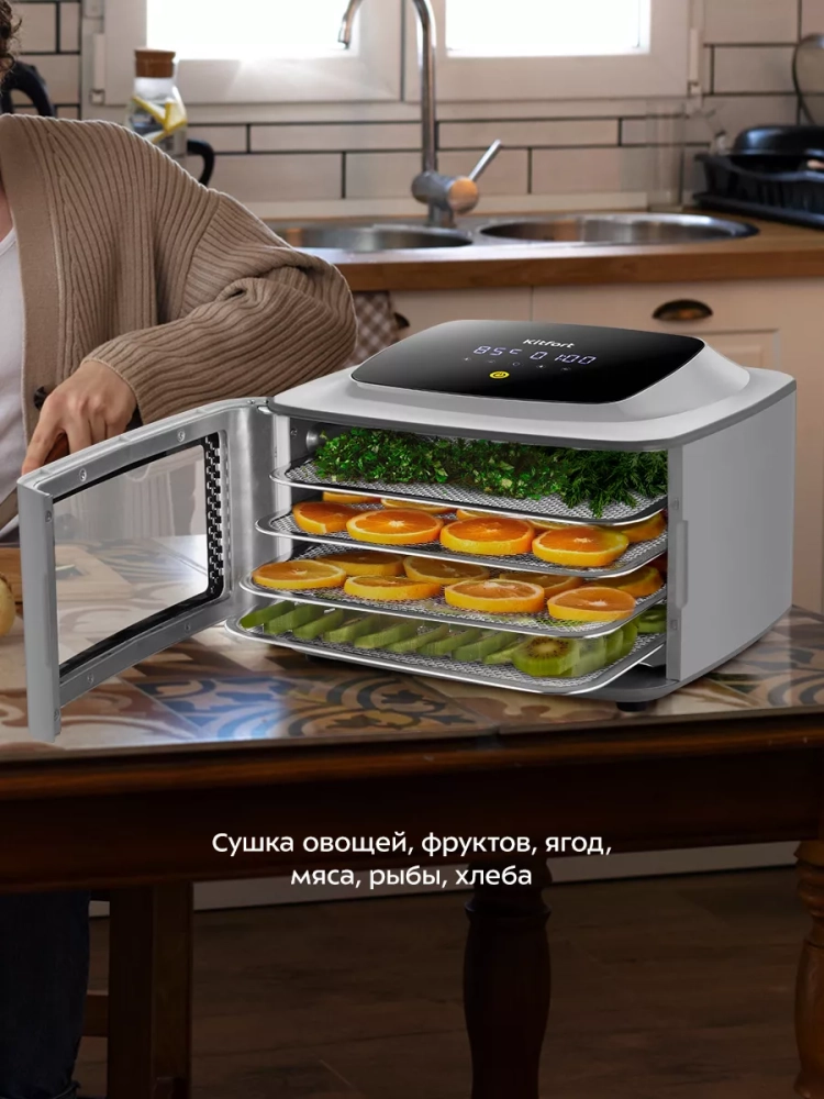 Сушилка для овощей и фруктов Kitfort — это не только функциональная техника, но и стильное дополнение к вашей кухне. Она позволяет сохранить витамины и минералы в продуктах, обеспечивая их длительное хранение. Электросушилка подходит для сушки ягод, грибов и зелени, а также для приготовления домашних чипсов из хлеба и других продуктов.