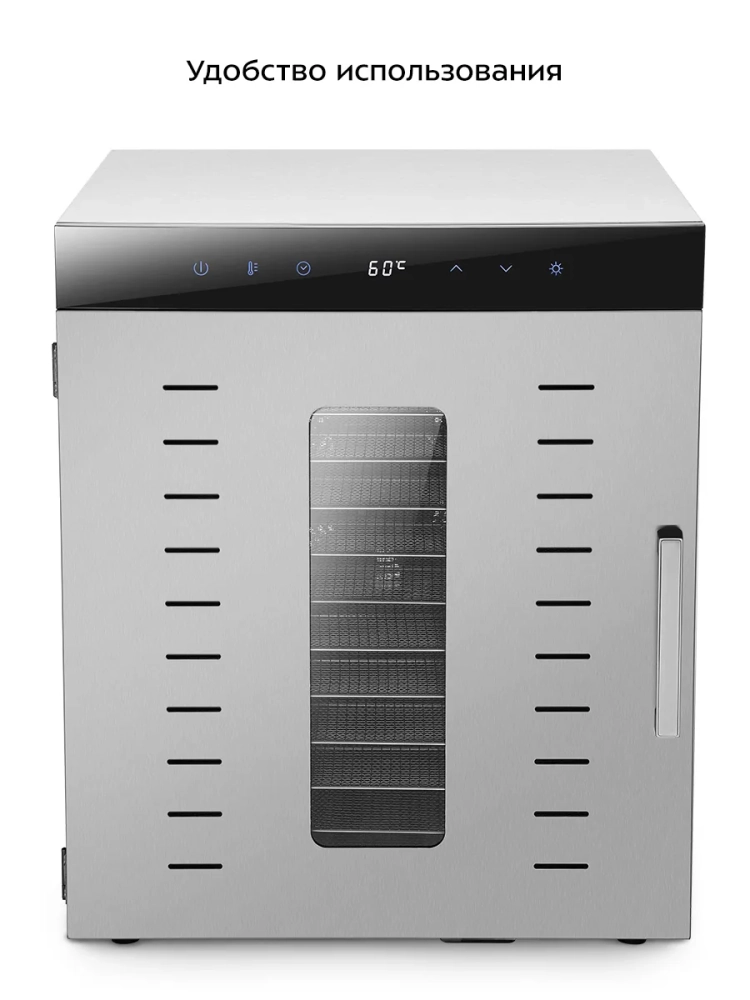 Температуру сушки можно изменить от 30 до 90 °С с шагом 5 °С. Сушилка оснащена таймером до 24 часов работы с шагом 30 минут. Подсветку камеры сушилки можно включать и выключать во время сушки.