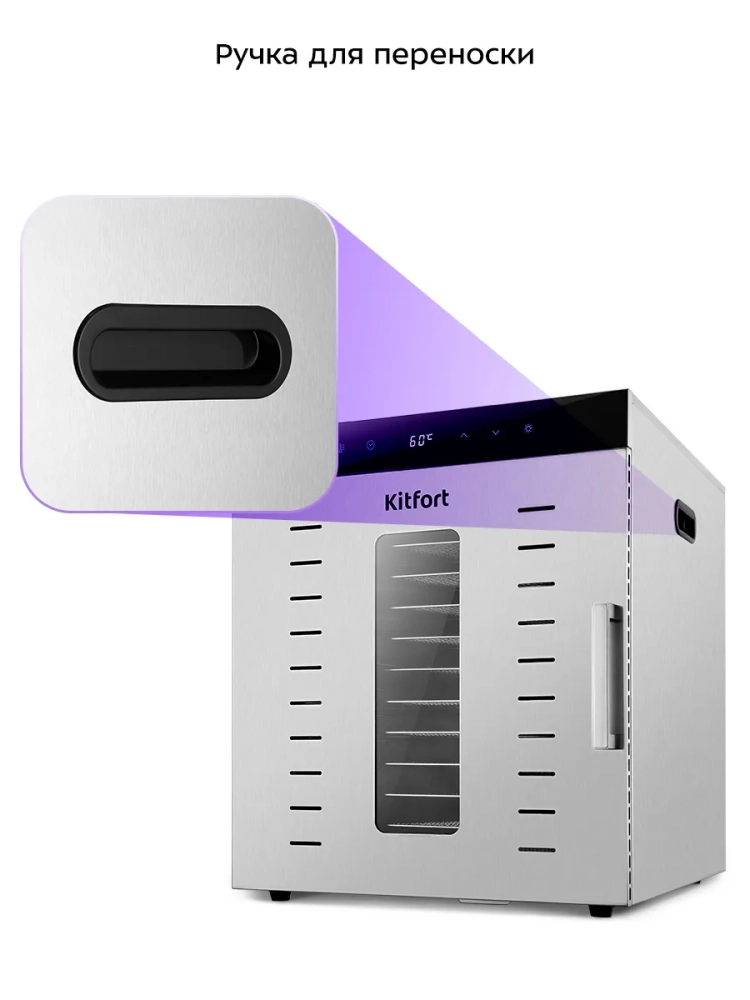 Электрическая сушилка Kitfort КТ-4913 предназначена для сушки овощей, фруктов, ягод, грибов, корнеплодов, трав и зелени, а также мяса и рыбы, хлеба.