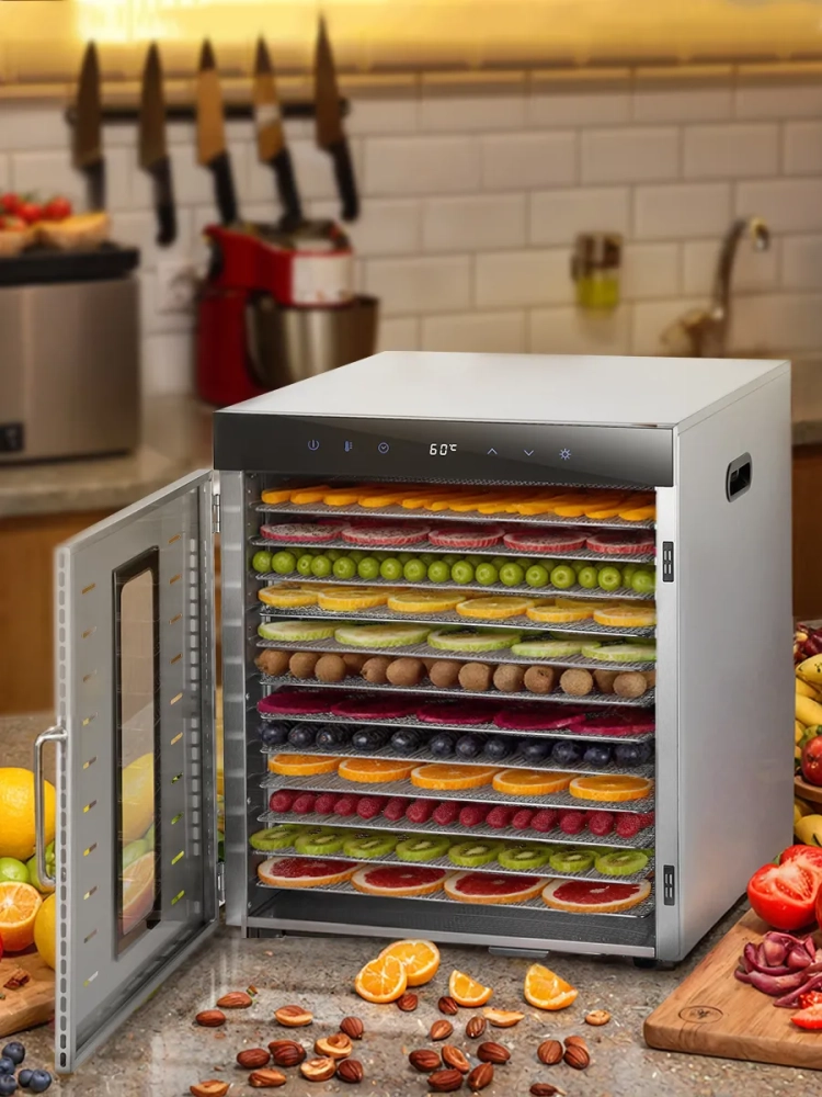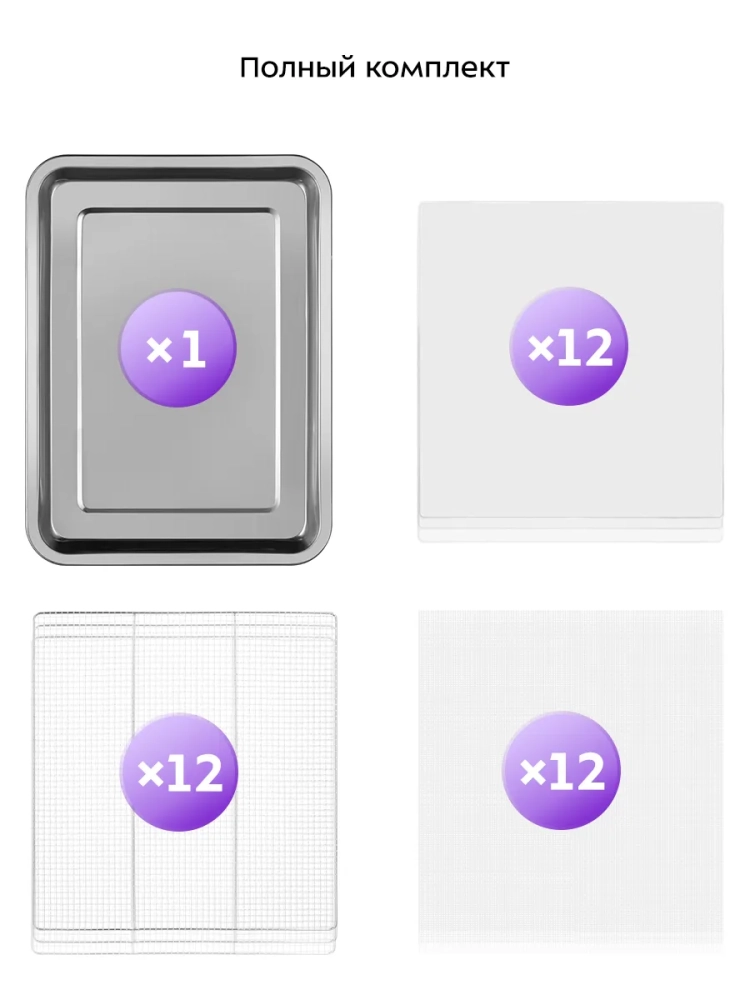 Сушилка имеет в комплекте 12 металлических поддонов, 12 сеток для мелких продуктов и 12 силиконовых сплошных поддонов. Также в комплект входит 1 поддон для жидкости, который облегчает очистку устройства: на поддон попадают остатки от продуктов и сок, после чего поддон легко достать и очистить, а дно камеры сушилки остается чистым.