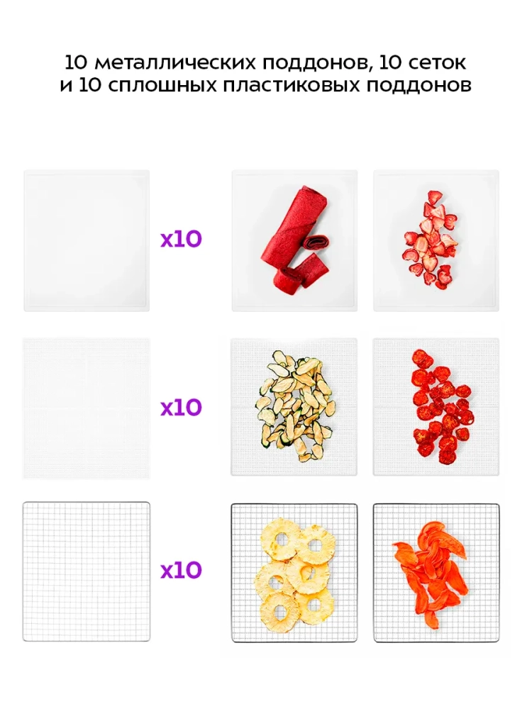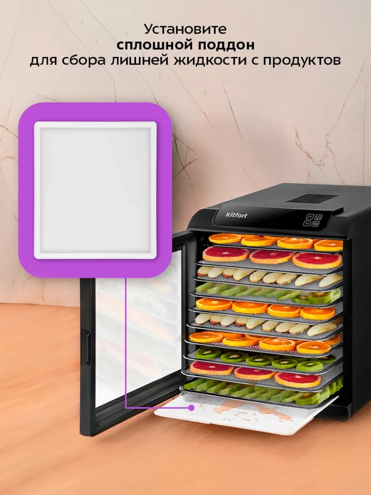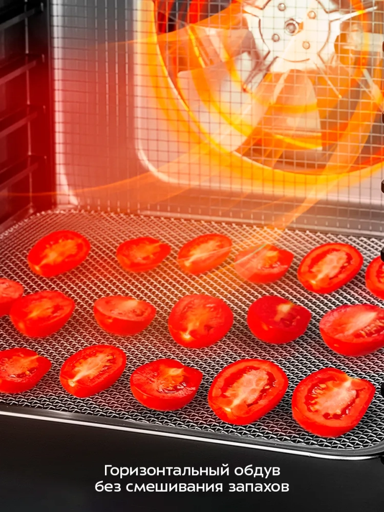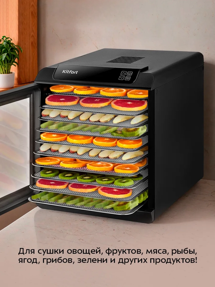 Электрическая сушилка для овощей и фруктов Kitfort КТ-4949 — это надежная бытовая техника, предназначенная для эффективной сушки различных продуктов. Кухонный прибор идеально подходит для обработки овощей, фруктов, ягод, грибов и даже мяса. Благодаря встроенному нагревательному элементу и вентилятору обеспечивается равномерное распределение горячего воздуха по всей камере гаджета. Это позволяет минимизировать смешение запахов при одновременной сушке разных продуктов. Сушилка оснащена 10 металлическими поддонами, 10 сплошными пластиковыми поддонами и 10 сетками. Размеры металлического поддона составляют 305 × 332 мм, а пластикового — 288 × 326 мм. Сетка имеет размеры 305 × 330 мм. Расстояние между поддонами составляет всего лишь 29 мм. Температура сушки регулируется в диапазоне от 35 до 70 °С с шагом в пять градусов Цельсия, что позволяет точно настроить процесс дегидрации в зависимости от типа продукта: будь то ягода или мясо. Таймер можно установить на период от получаса до почти двадцати часов (19,5 ч) с шагом в полчаса. Эта электросушилка работает при напряжении ~220–240 В и частоте тока в диапазоне от пятидесяти до шестидесяти герц (50/60 Гц). Мощность устройства варьируется между шестьюстами и семьюстами ватт (600–700 Вт), что делает его энергоэффективным выбором для домашнего использования. Kitfort КТ-4949 — это не просто дигидратор; это универсальный дегидратор для создания пастилы из фруктов или овощей дома! Овощесушилка также подходит для приготовления вкусных закусок из мяса или рыбы без добавления консервантов.