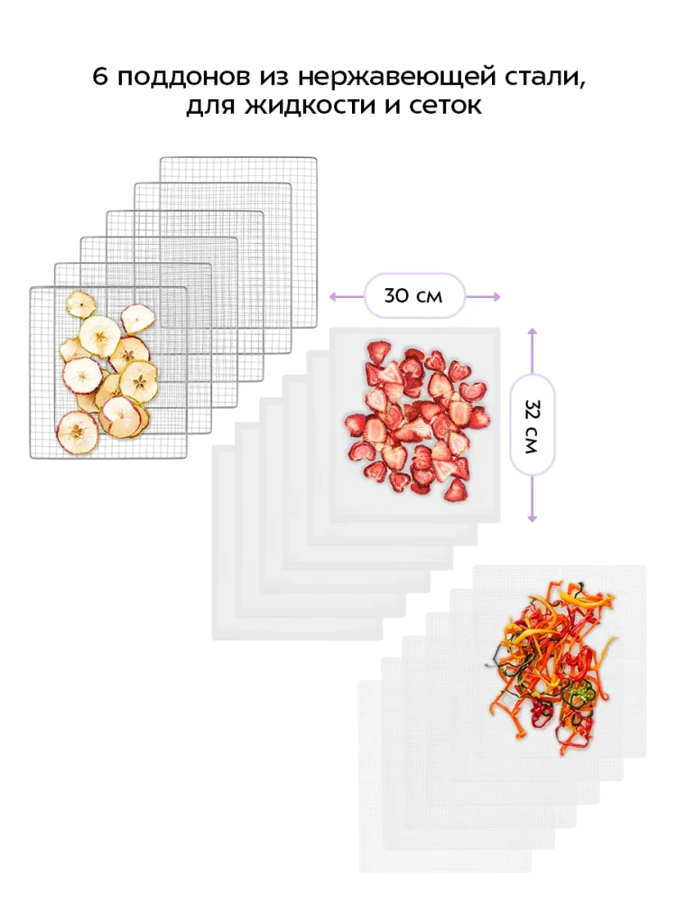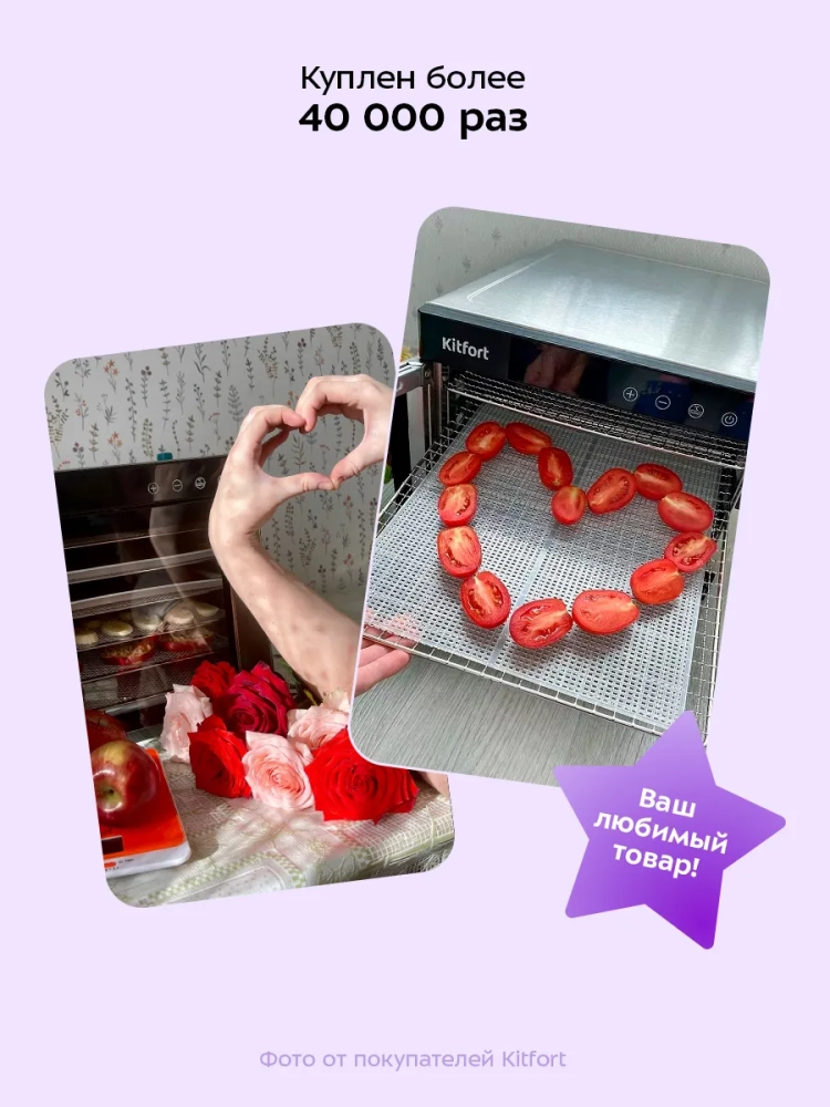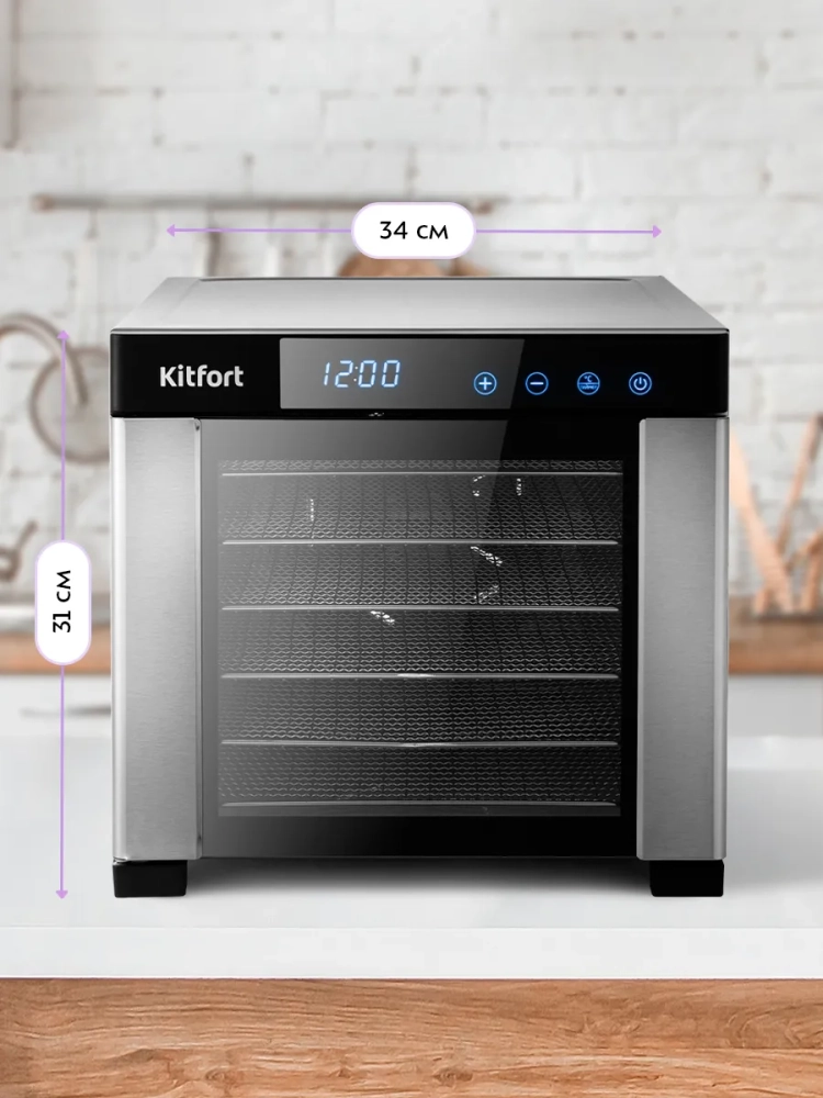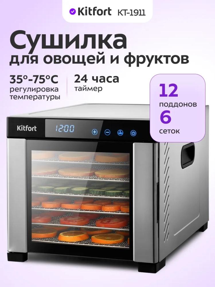 Электрическая сушилка Kitfort КТ-1911 – это идеальный бытовой прибор для тех, кто ценит качество и удобство в процессе сушки продуктов. Этот дегидратор предназначен для эффективной обработки овощей, фруктов, ягод, грибов и зелени, а также мяса. Благодаря мощному нагревательному элементу и вентилятору большого диаметра обеспечивается равномерное распределение горячего воздуха по всей камере сушилки. Это позволяет минимизировать смешение запахов при одновременной сушке различных продуктов. Сушилка оснащена 6 поддонами из нержавеющей стали, которые идеально подходят для размещения овощей и фруктов. В комплект также входят 6 поддонов для жидкости, что делает возможным приготовление пастилы или других жидких блюд. Для мелких продуктов предусмотрены специальные сетки. Корпус электросушилки выполнен из прочного металла с дверцей из стекла и металла, что позволяет наблюдать за процессом без необходимости открывать устройство. Температура сушки регулируется в диапазоне от 35 до 75 градусов Цельсия с шагом в 5 градусов, что дает возможность подобрать оптимальный режим для каждого типа продукта. Эта овощесушилка также оснащена таймером на срок до 24 часов работы с шагом в полчаса – это удобно для планирования времени работы устройства без вашего участия. Сушка может быть использована не только как дегидратор для фруктов или овощей: она отлично справляется со всеми видами зелени и даже мясными продуктами. Kitfort КТ-1911 – это надежная электросушилка высокого качества, которая станет незаменимым помощником на вашей кухне.