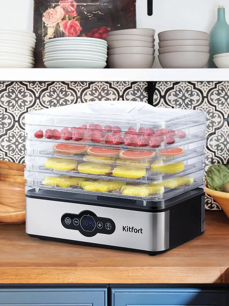Эта кухонная техника идеально подходит для приготовления домашних заготовок из овощей и фруктов, а также для сушки мяса и рыбы. Дегидратор Kitfort станет надежным помощником на вашей кухне, позволяя готовить полезные и вкусные закуски. Электрическая сушилка также подходит для сушки хлеба и хлебобулочных изделий, что делает её универсальным устройством для любой кухни.
