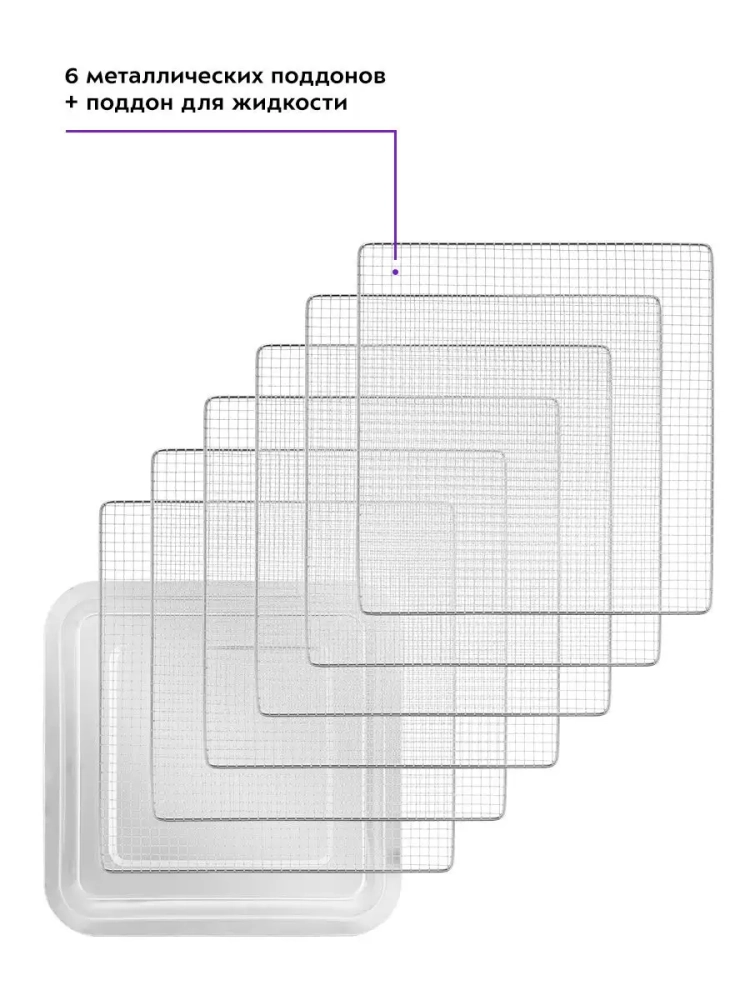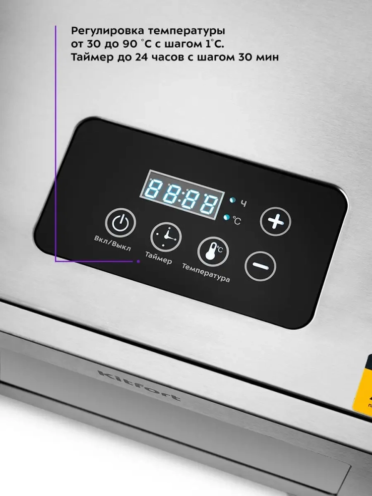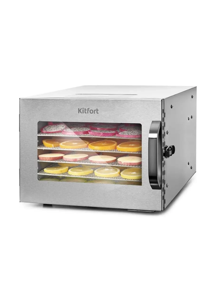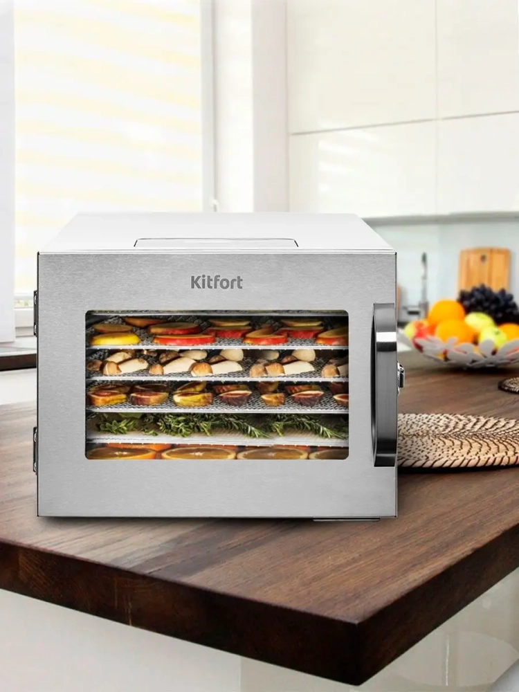 Электрическая сушилка Kitfort КТ-1917 предназначена для сушки овощей, фруктов, ягод, грибов, корнеплодов, трав и зелени, а также мяса и рыбы, хлеба. Сушилка имеет в комплекте 6 поддонов для сушки и 1 поддон для жидкости. Поддоны выполнены из нержавеющей стали. В сушилке установлен мощный нагревательный элемент и вентилятор большого диаметра, обеспечивающий равномерное распределение нагретого воздуха по всему объему камеры. Благодаря горизонтальному обдуву смешение запахов при сушке одновременно разных продуктов минимально. На сушилке можно установить температуру сушки в диапазоне 35-90 *С с шагом 5 градусов. Сушилка оснащена таймером до 24 часов работы с шагом 30 минут.
