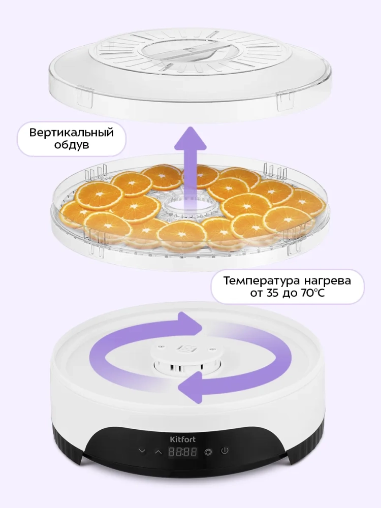 Электрическая сушилка для овощей и фруктов мощностью 380 Вт — это незаменимый бытовой прибор для вашей кухни. Этот дегидратор позволяет эффективно проводить сушку овощей, фруктов, ягод, грибов и зелени, сохраняя их питательные свойства. Сушилка оснащена пятью прозрачными поддонами, что обеспечивает удобство наблюдения за процессом сушки. Электросушилка Kitfort КТ-1953 отличается мощным нагревательным элементом и вентилятором, которые равномерно распределяют нагретый воздух по всей камере, обеспечивая качественную сушку продуктов.