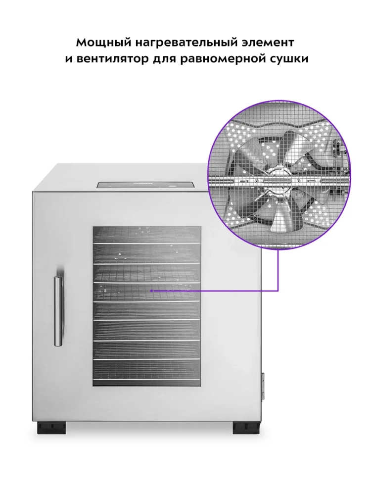 Важной особенностью данной модели является мощный нагревательный элемент в сочетании с вентилятором большого диаметра. Это обеспечивает равномерное распределение горячего воздуха по всей камере сушилки. Благодаря горизонтальному обдуву минимизируется смешение запахов при одновременной сушке разных продуктов.