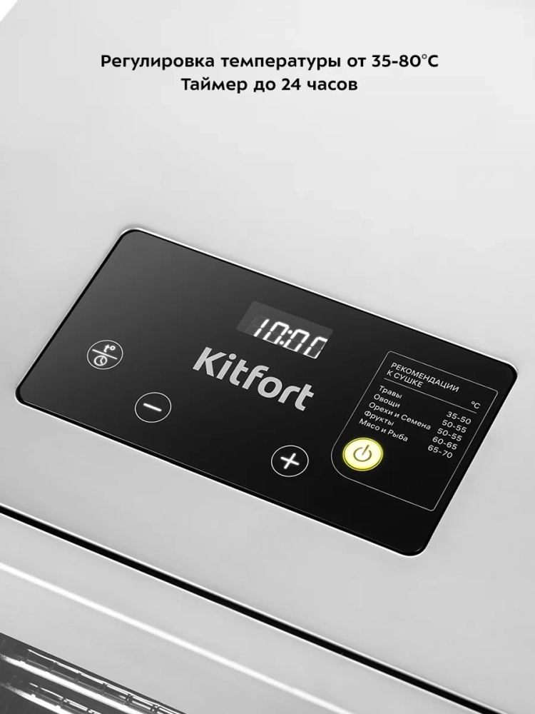 Сушилка Kitfort КТ-1955 имеет встроенную подсветку, что позволяет наблюдать за процессом сушки без необходимости открывать устройство. Температура сушки регулируется в диапазоне от 35 до 80 градусов Цельсия с шагом в один градус — это позволяет точно настроить режим работы под каждый тип продукта.