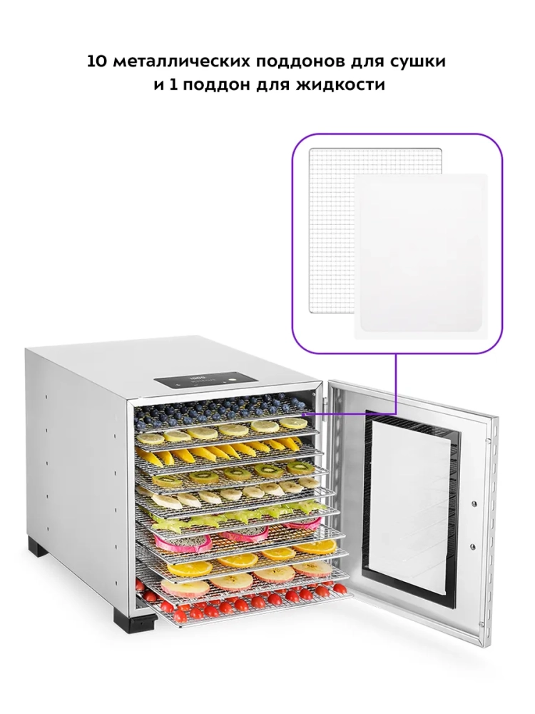 Электрическая сушилка для овощей и фруктов Kitfort КТ-1955 мощностью 800 Вт — это идеальное решение для сушки различных продуктов. Она предназначена для обработки овощей, фруктов, ягод, грибов, корнеплодов, трав и зелени. Также она подходит для мяса и рыбы, а также хлеба. Сушилка оснащена 10 поддонами из нержавеющей стали и одним поддоном для жидкости. Это делает её универсальной в использовании.