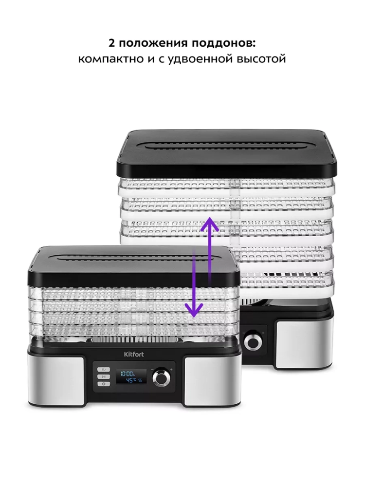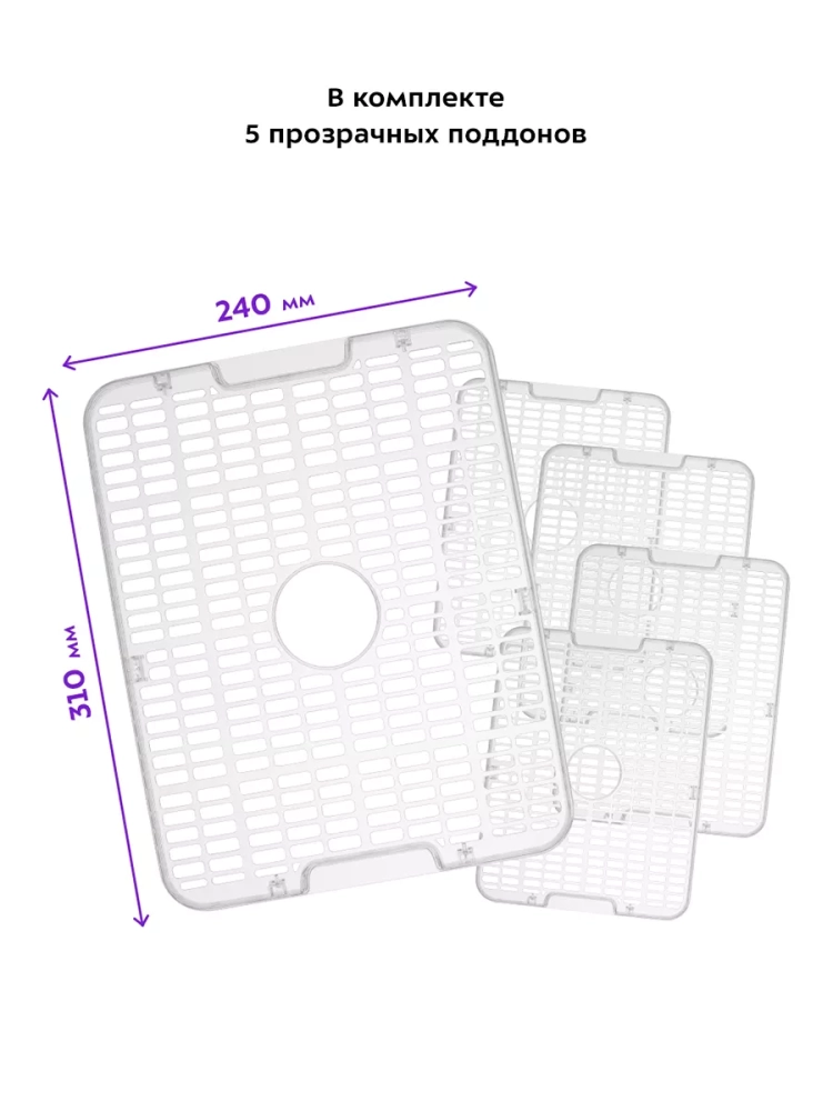 Сушилка оснащена пятью прозрачными пластиковыми поддонами, которые позволяют наблюдать за процессом сушки в реальном времени. Поддоны легко устанавливаются друг на друга, что делает использование устройства простым и удобным. Размер каждого поддона составляет 310 х 240 мм, а расстояние между ними можно регулировать от 13 до 25 мм в зависимости от объема продуктов.