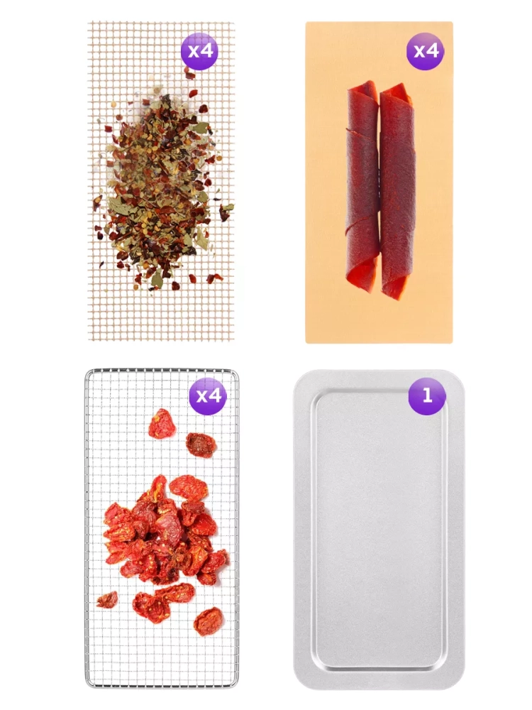 В комплект сушилки входят 4 поддона из нержавеющей стали, 4 сетки и 4 поддона для пастилы. Также у сушилки есть поддон для жидкости, который устанавливается на дно камеры. В поддон для жидкости попадает сок с продуктов во время сушки, благодаря чему дно прибора остается чистым.