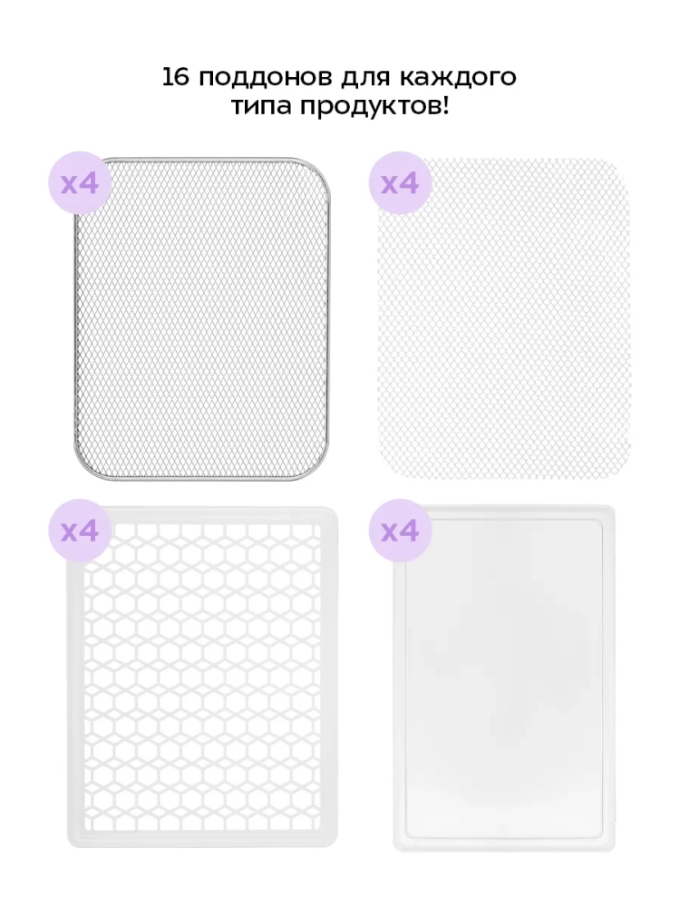В комплект сушилки входят 4 металлических поддона, 4 пластиковых поддона, 4 сплошных поддона и 4 сетки.