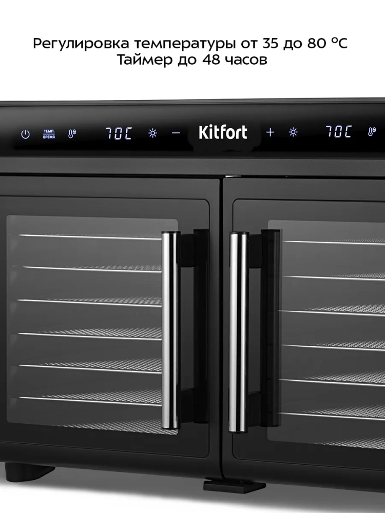 Температуру сушки можно настроить от 35 до 80 °С с шагом 5 °С. Время приготовления настраивается от 30 минут до 48 часов с шагом 30 минут.