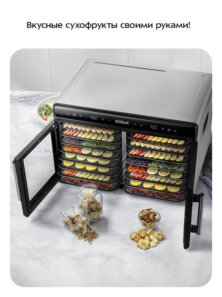 Электрическая сушилка для овощей и фруктов Kitfort КТ-4962 предназначена для сушки овощей, фруктов, ягод, грибов, корнеплодов, трав и зелени, а также мяса и рыбы, хлеба. С помощью специальных сплошных пластиковых поддонов можно готовить пастилу.